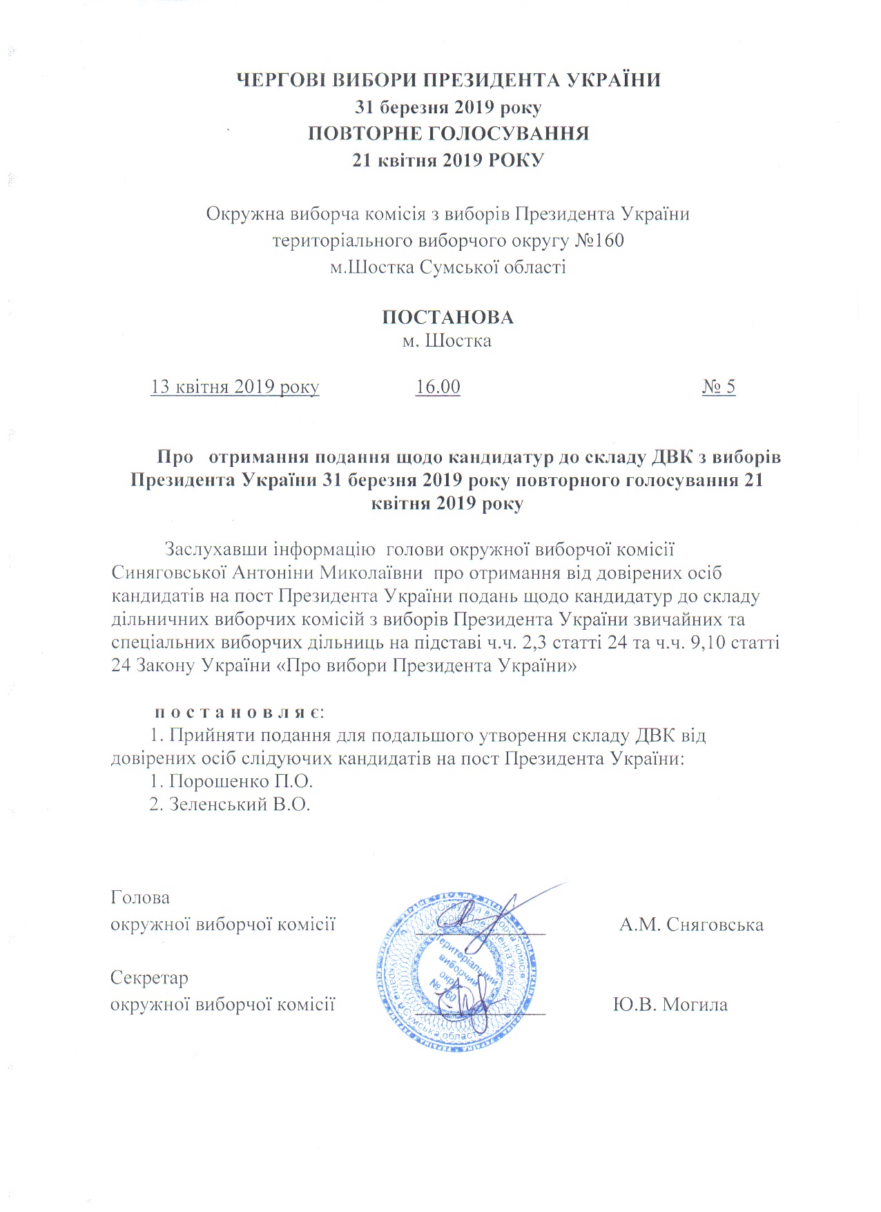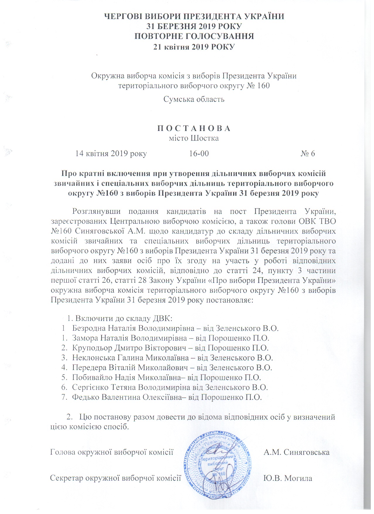 Про затвердження подання щодо кандидатур до складу дільнисних виборчих комісій звичайних і спеціальних виборчих дільниць територіального виборчого округу № 160 з виборів Президента України 31 березня 2019 року повторного голосування 21 квітня 2019 року |