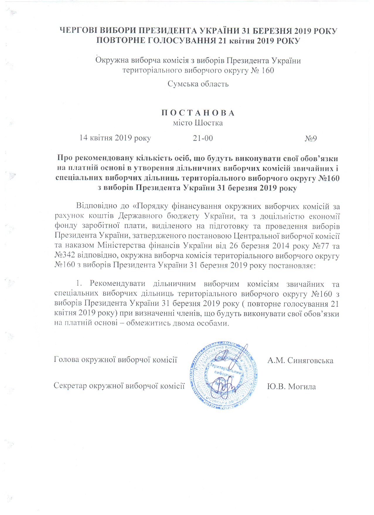 Про рекомендовану кількість осіб, що будуть виконувати свої обов'язки на платній основі в утворенних дільничних виборчих комісій звичайних і спеціальних виборчих дільниць територіального виборчого округу № 160 з виборів Президента України 31 березня 2019 року |