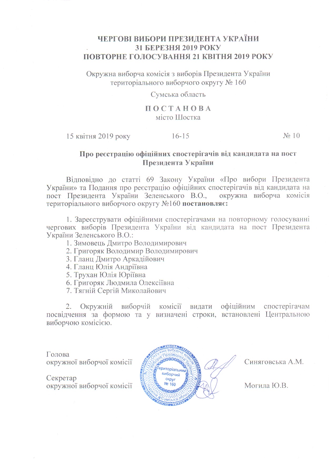 Про реєстрацію офіційних спостерігачів від кандидата на пост Президента України |