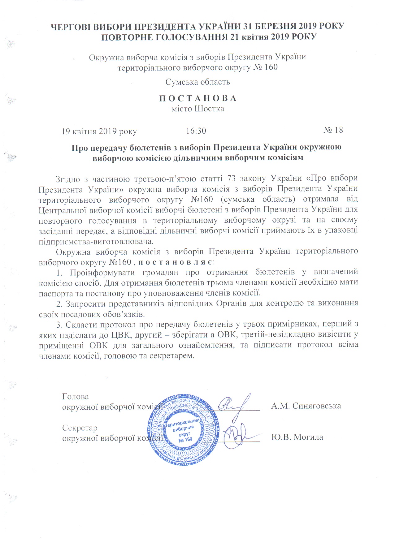 Про передачу бюлетнів з виборів Президента України окружною виборчою комісією дільничним виборчим комісіям |