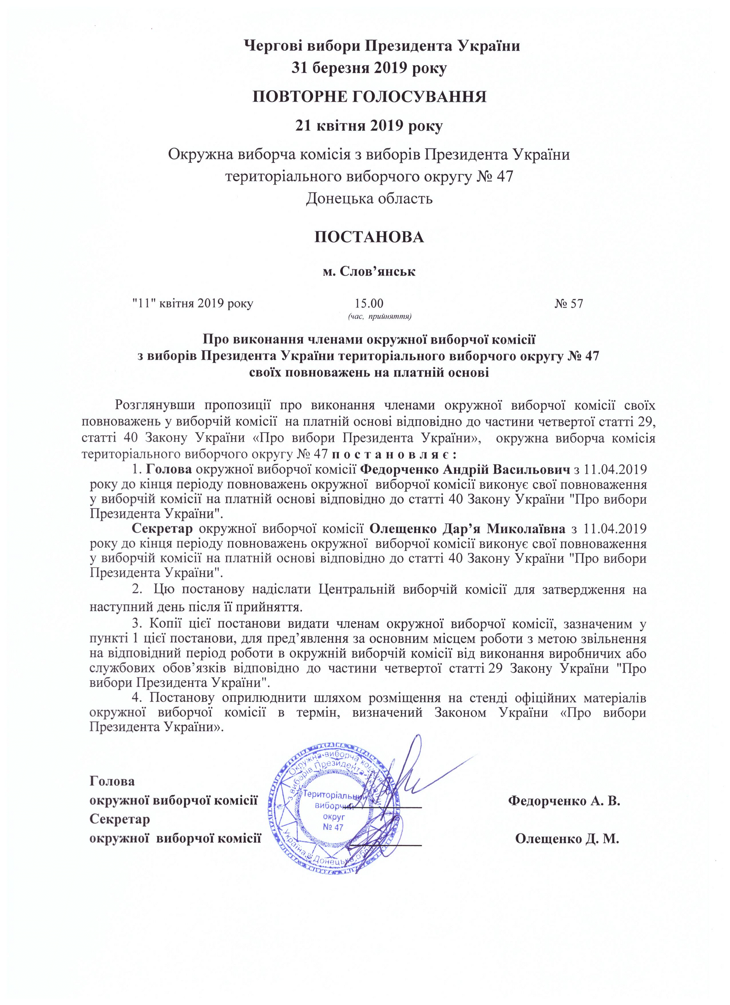 Про виконакння членами окружної комісії з виборів Президента України територіального виборчого округу № 47 своїх повноважень на платній основі |