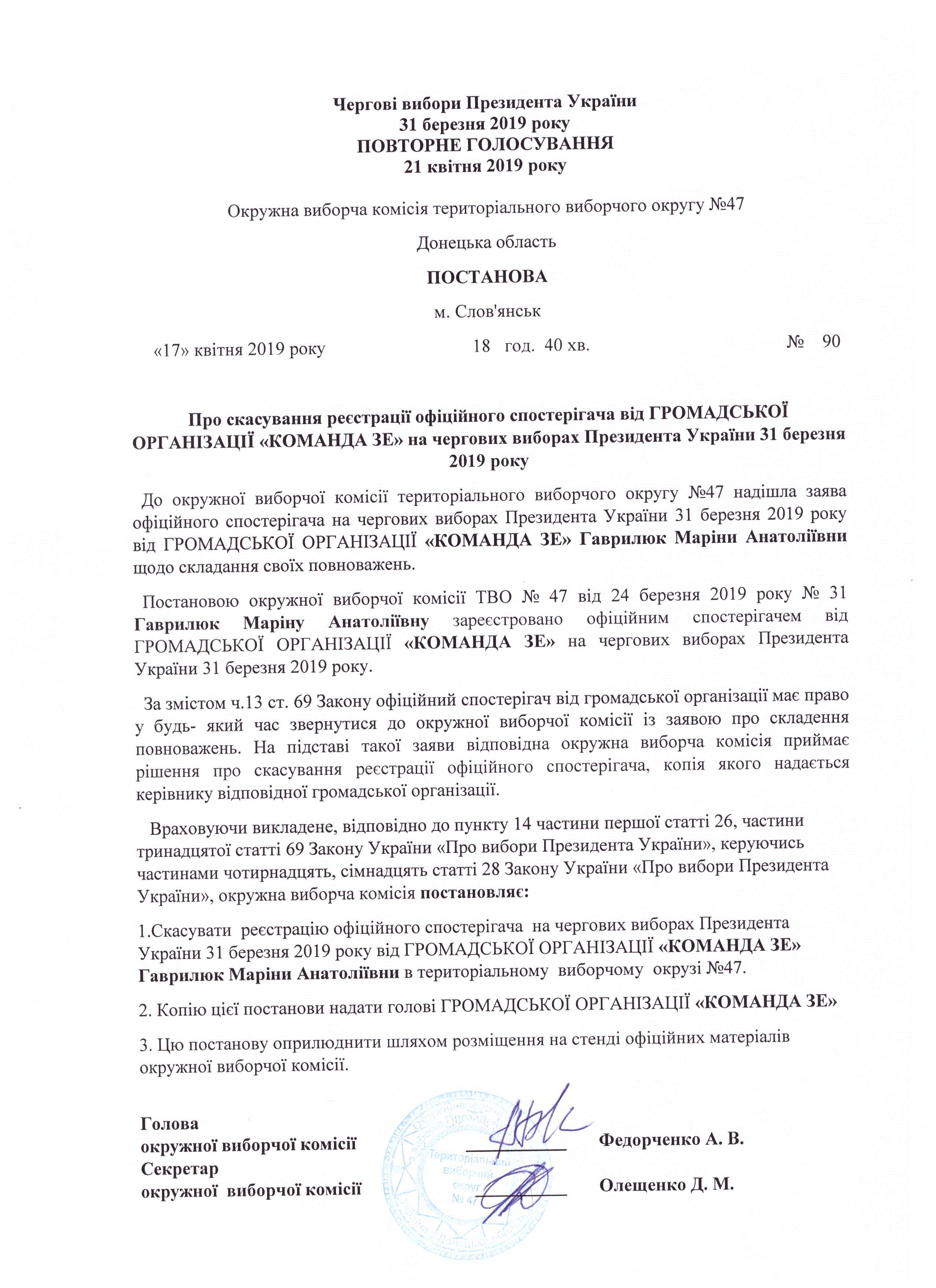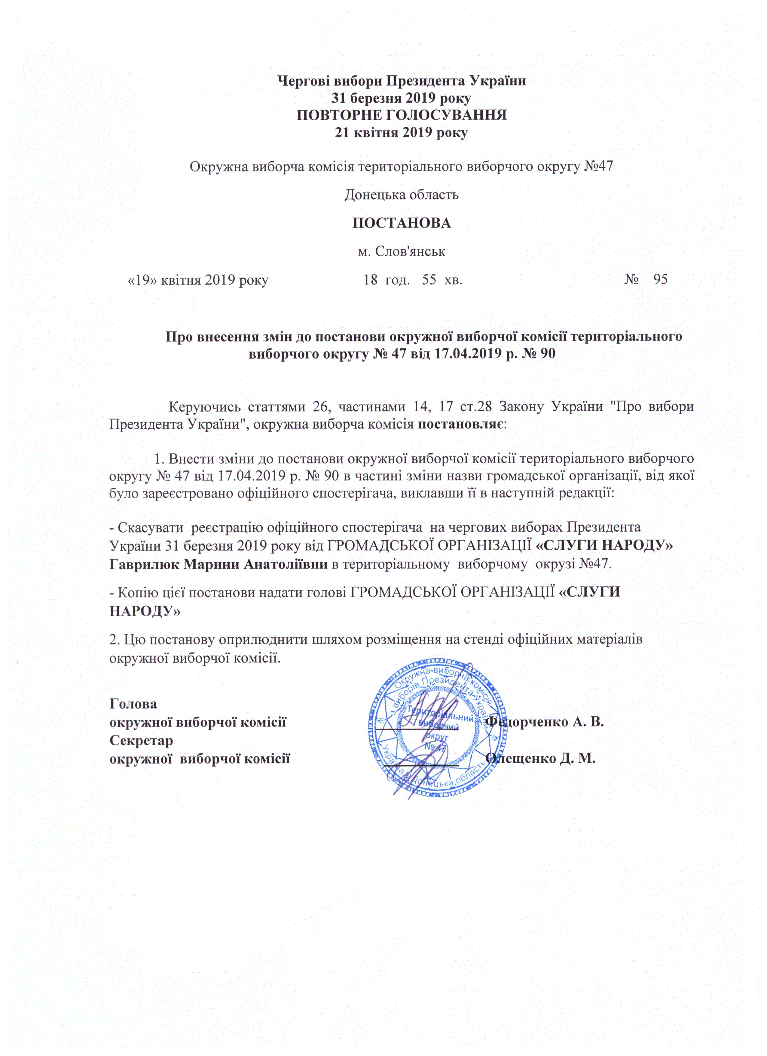 Про внесення змін до постанови окружної виборчої комісії територіального виборчого округу № 47 від 17.04.2019 № 90 |