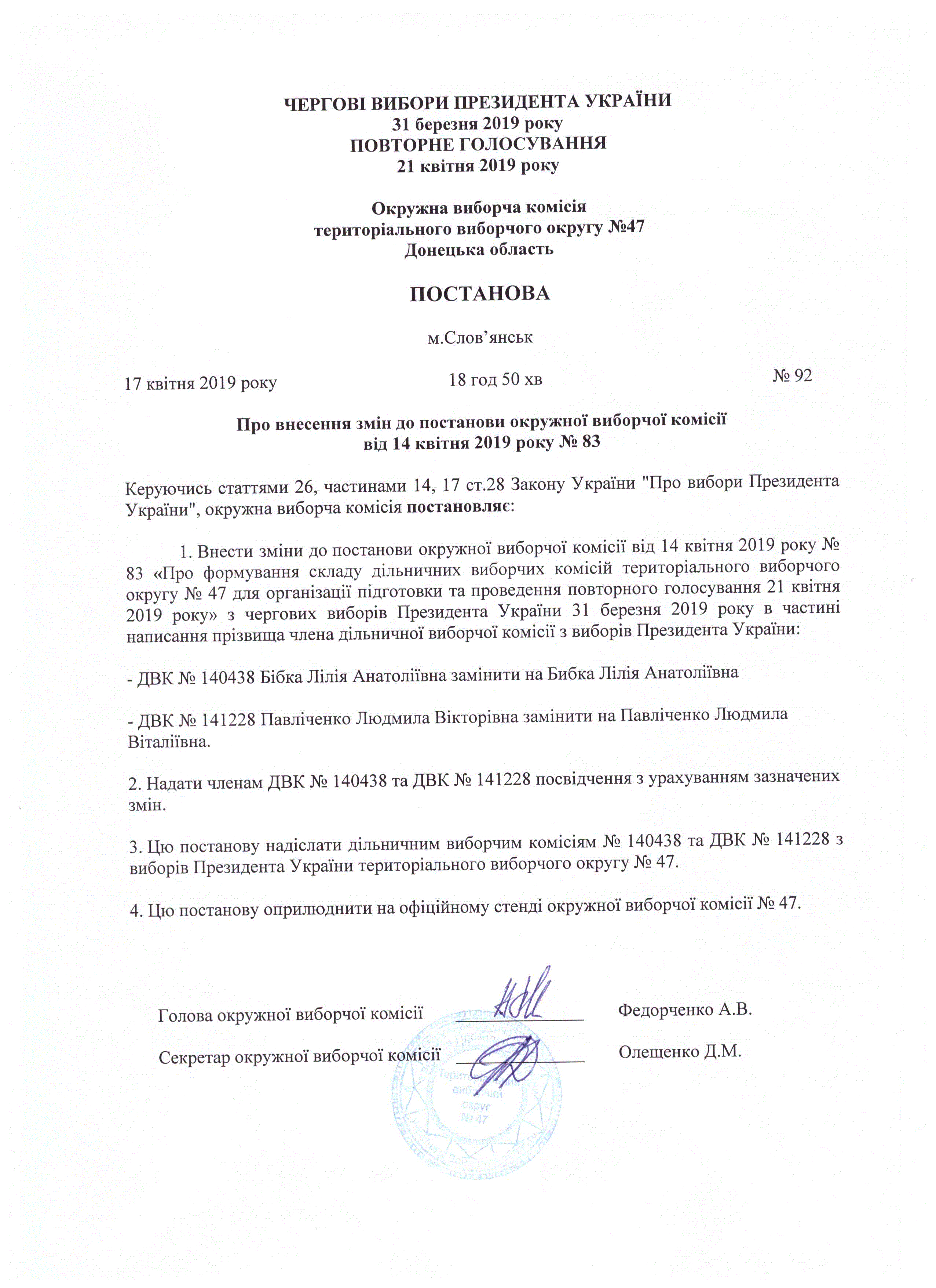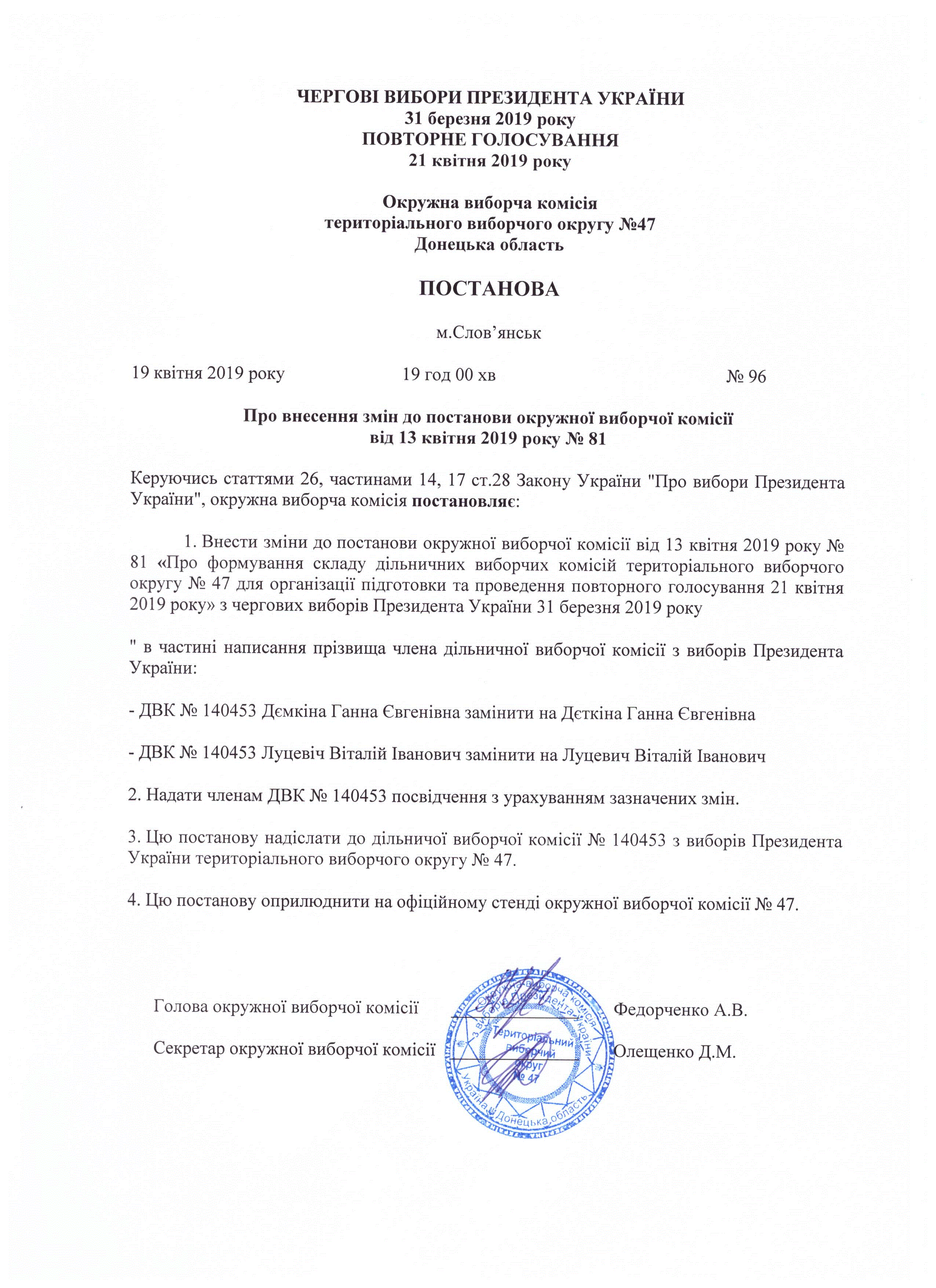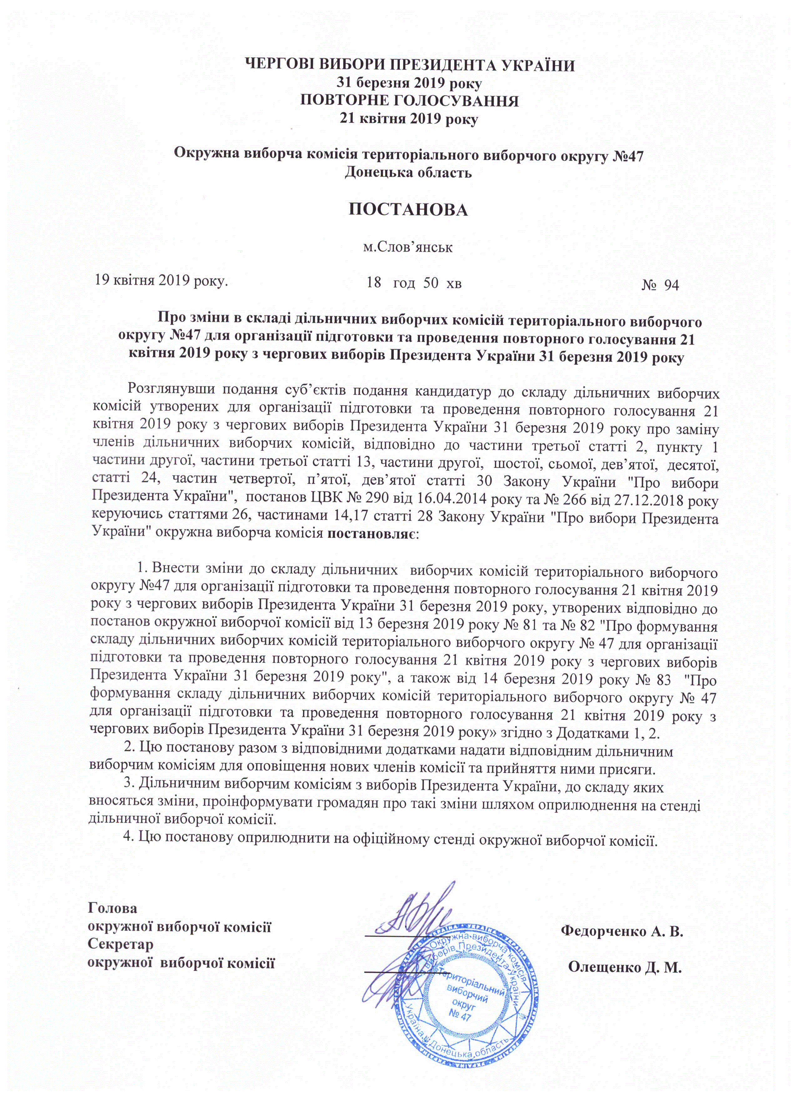 Про зміни в складі дільничних виборчих комісій територіального виборчого округу № 47 для організації підготовки та проведення повторного голосування 21 квітня 2019 року з чергових виборів Президента України 31 березня 2019 року |