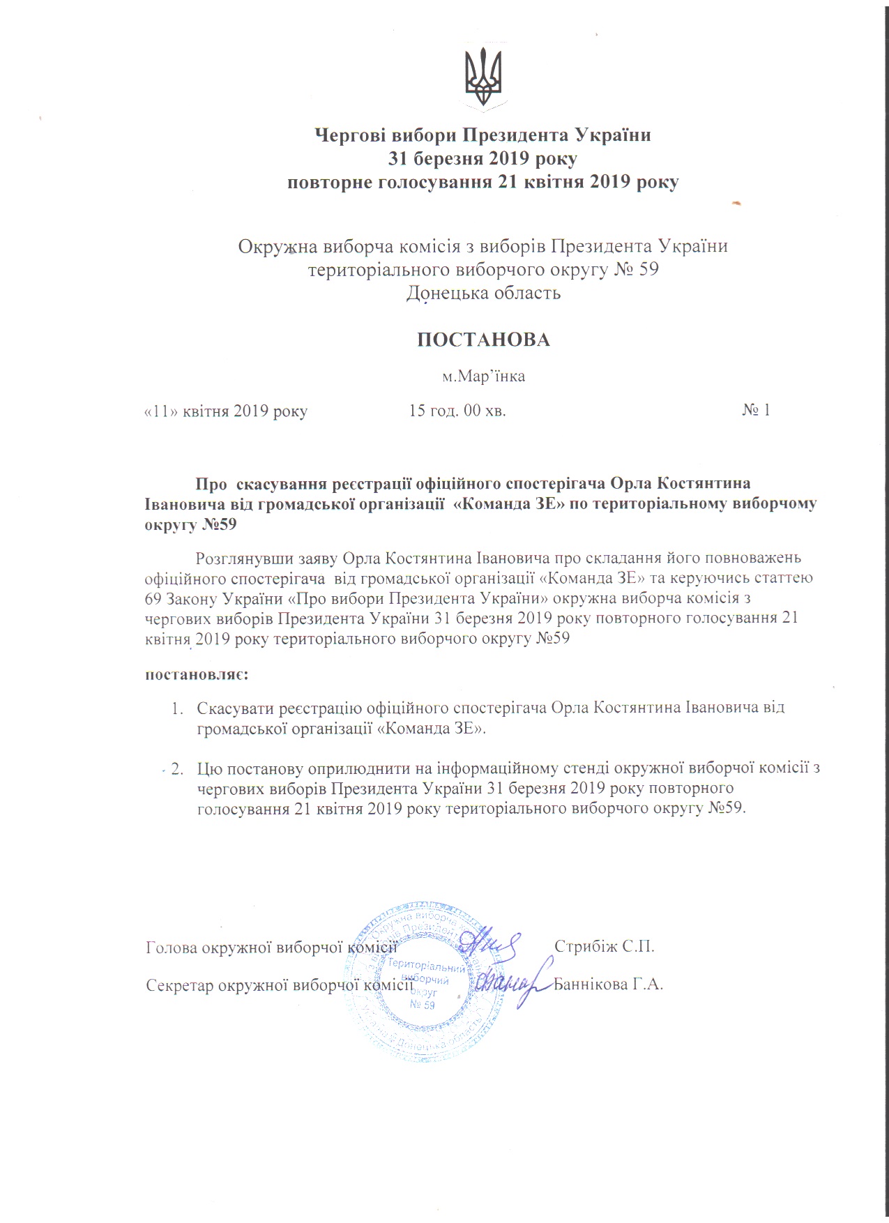 Про розподіл обов'язків голови, секретаря та членів окружної виборчої комісії з виборів Президента України 31 березня 2019 року повторного голосування 21 квітня 2019 року територіального виборчого округу № 59 |