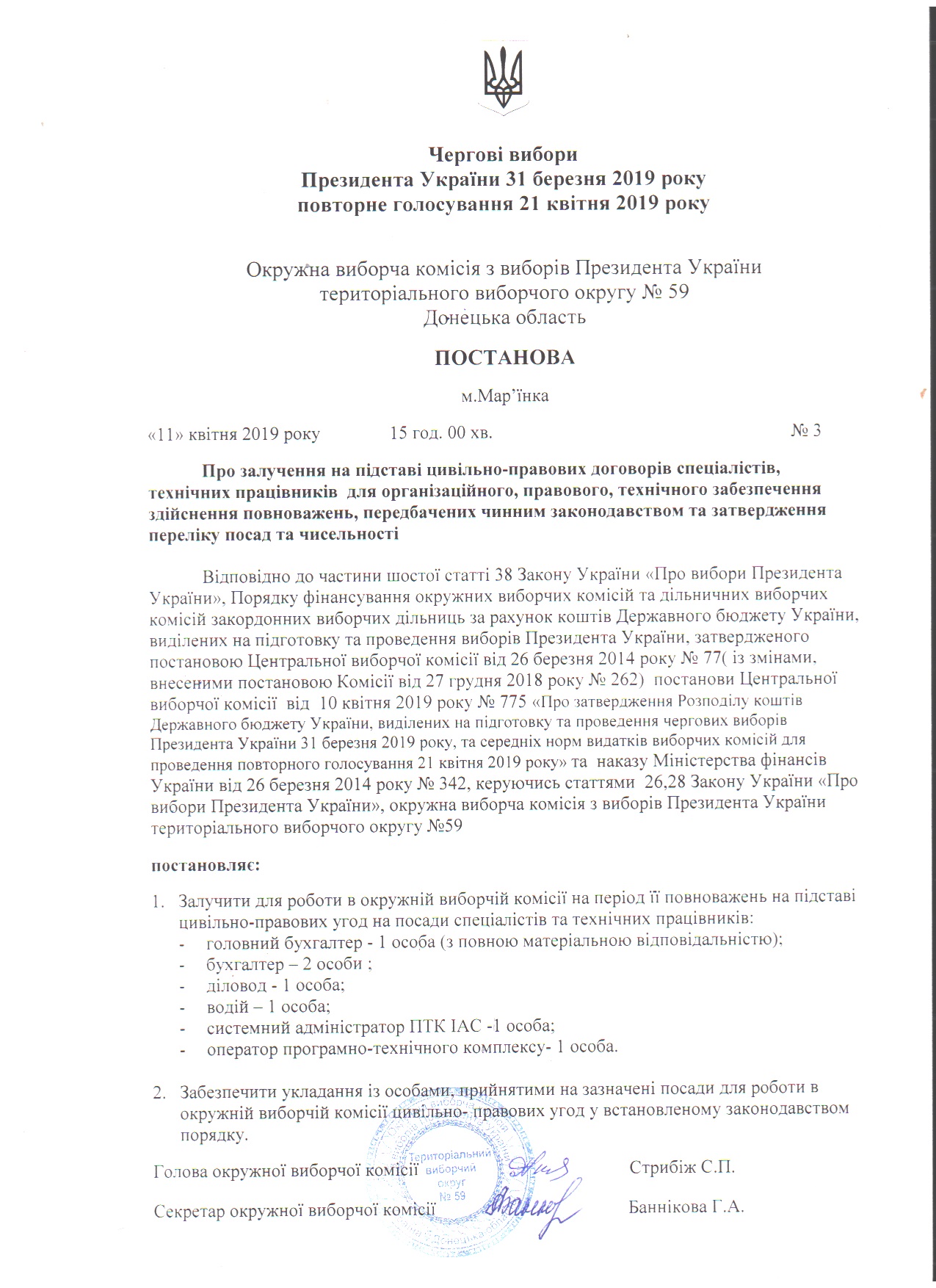 Про затвердження рішень дільничних виборчих комісій територіального виборчого округу №59 про залучення на підстваві цивільно-правових договорів відповідних спеціалістів та технічних працівників на чергових виборах Президента України 31 березня 2019 року з повторного голосування 21 квітня 2019 року |