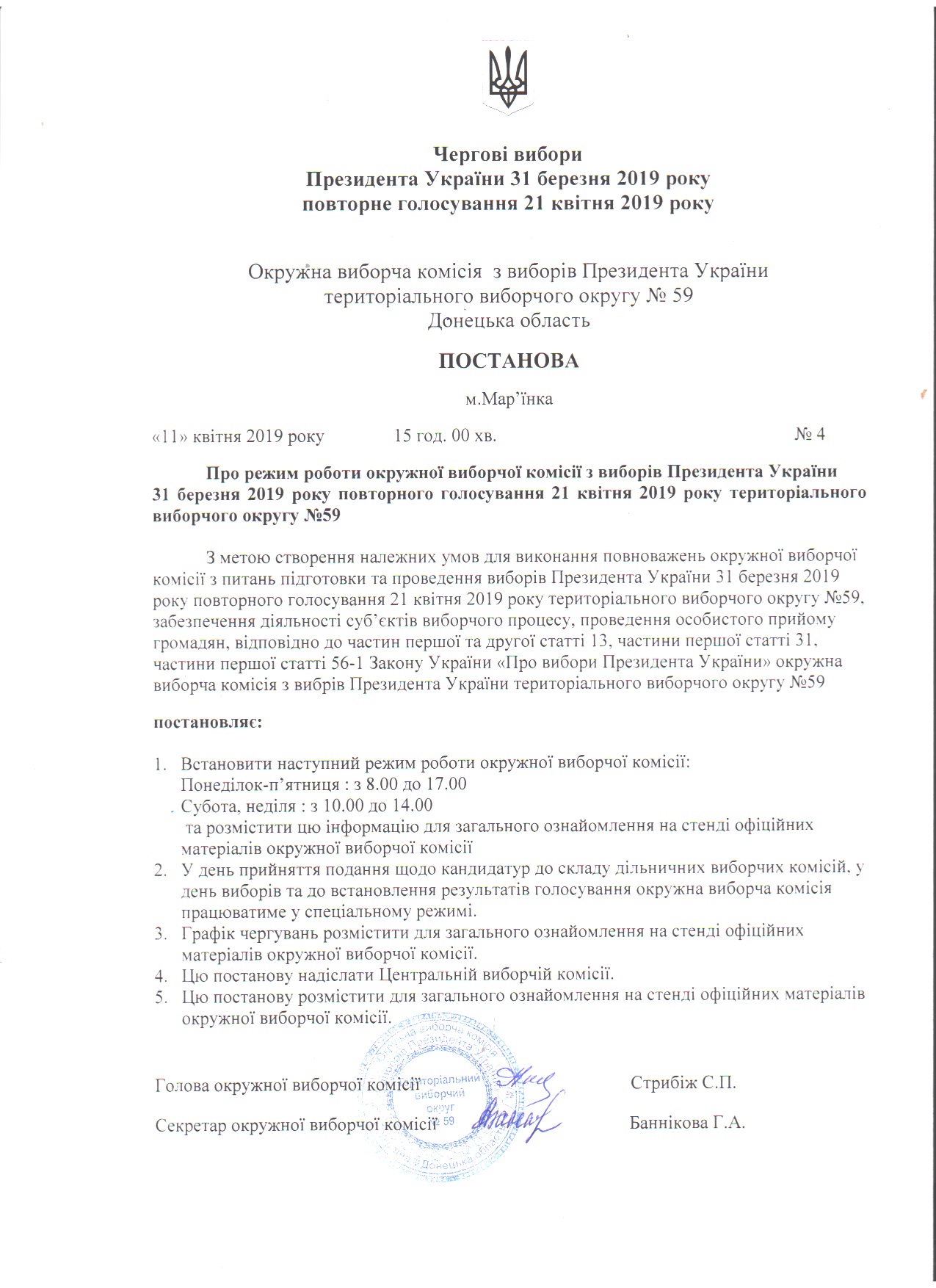 Про режим роботи окружної виборчої комісії з виборів Президента України 31 березня 2019 року повторного голосування 21 квітня 2019 року територіального виборчого округу № 59 |
