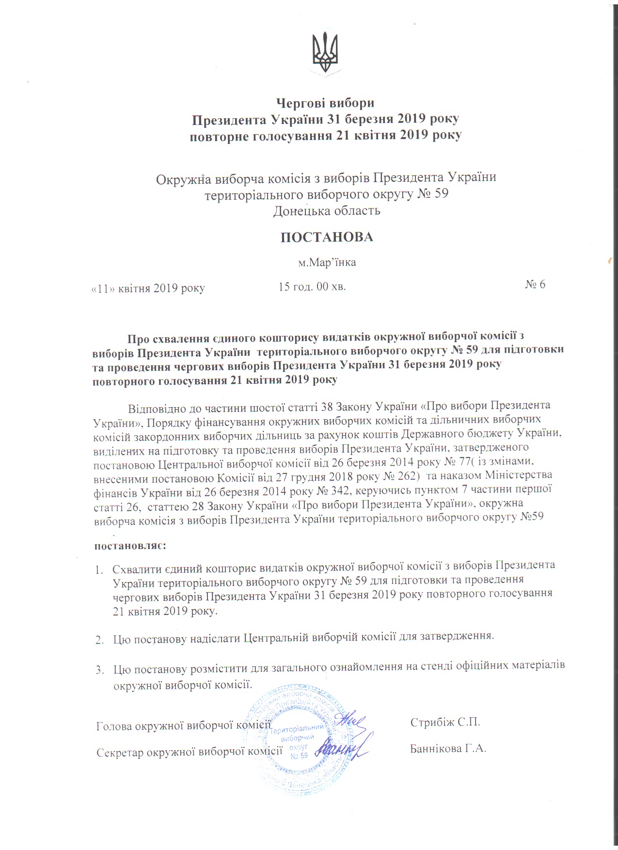 Про схвалення єдиного кошторису видатків окружної виборчої комісії з виборів Президента України територіального виборчого округу № 59 для підготовки та проведення чергових виборів Президента України 31 березня 2019 року повторного голосування 21 квітня 2019 року |