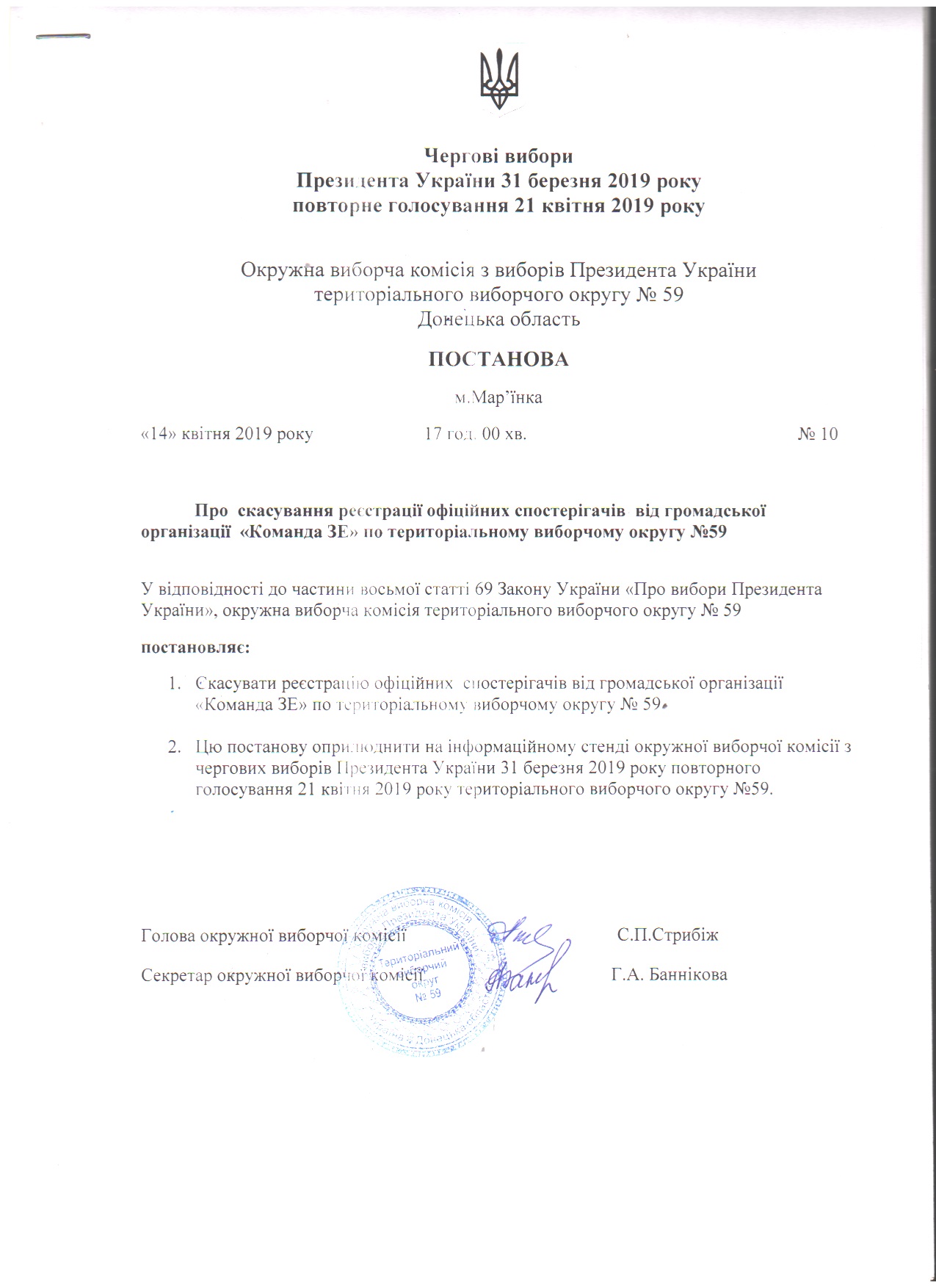 Про розгляд подання щодо реєстрації офіційних спостерігачів від громадської організації "Команда ЗЕ" на чергових виборах Президента України 31 березня 2019 року в день повторного голосування 21 квітня 2019 року в територіальному виборчому окрузі №59 |