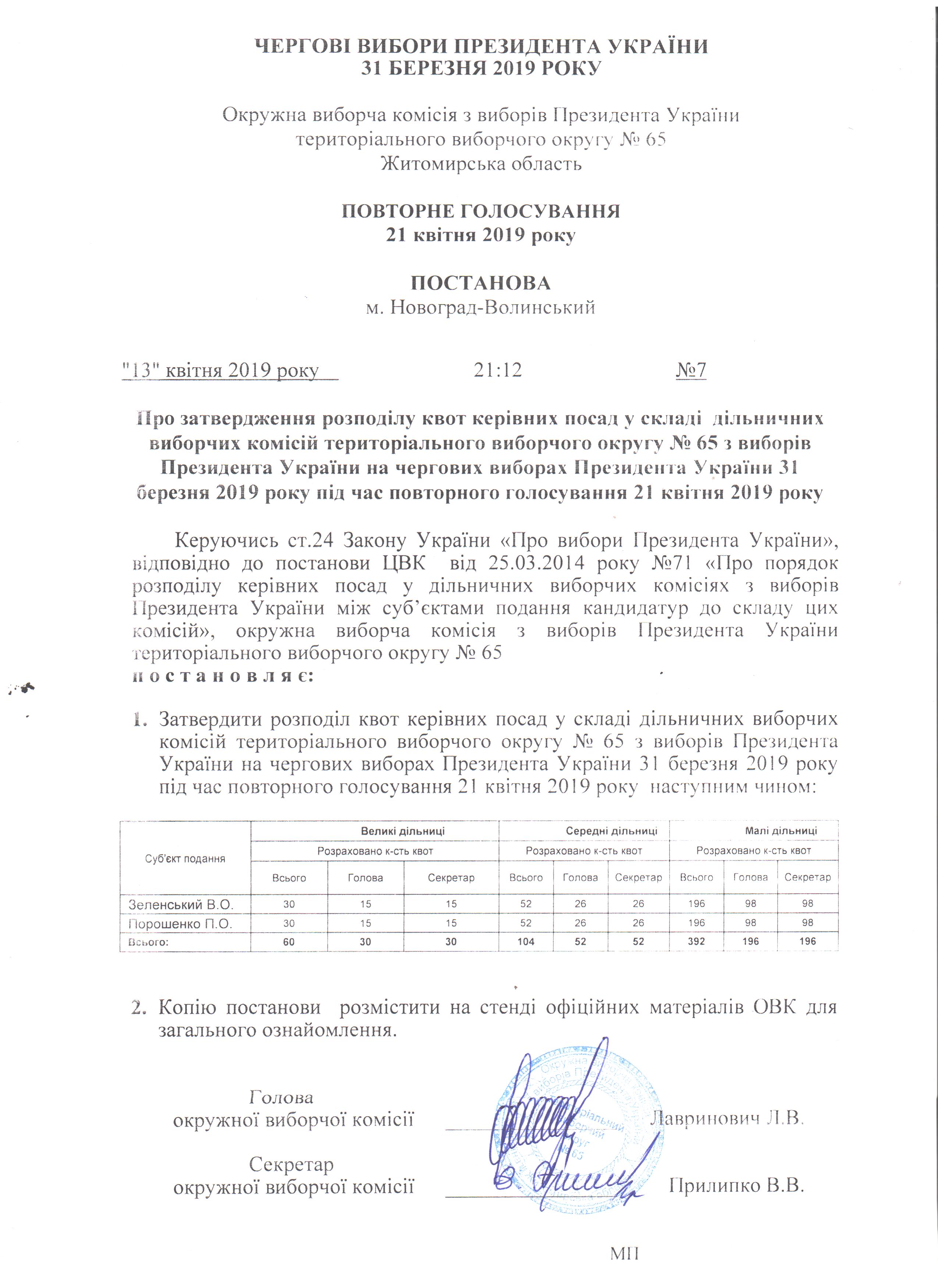Про затвердження розподілу квот керівних посад у складі дільничих виборчих комісій територіального виборчого округу № 65 з виборів Президента України на чергових виборах Президента України 31 березня 2019 року повторного голосування 21 квітня 2019 року в тво №65 |