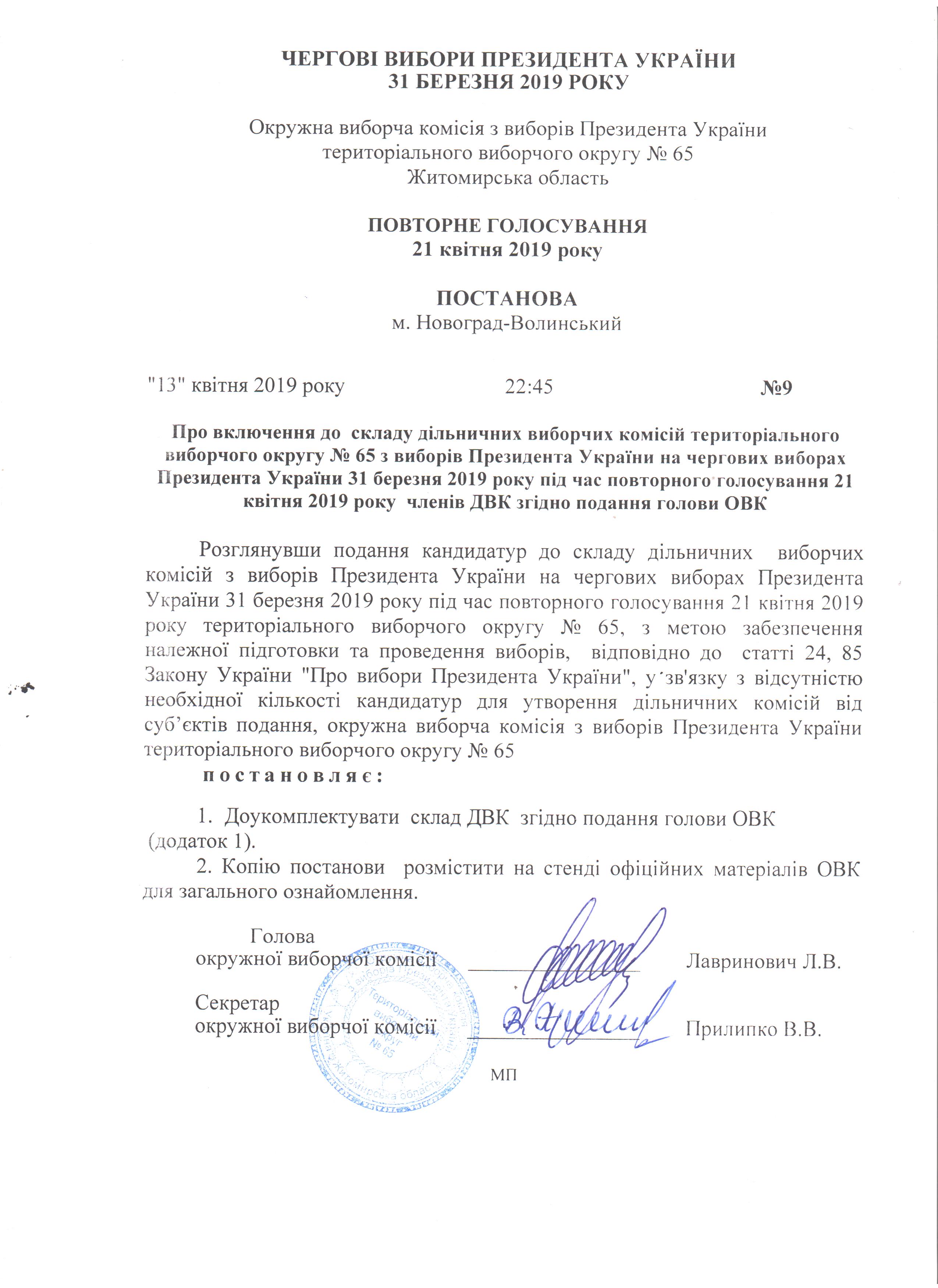 Про включення до складу ДВК тво №65 з виборів Президента України 31 березня 2019 р. під час повторного голосування 21 квітня 2019 року членів ДВК згідно подання голови ОВК |