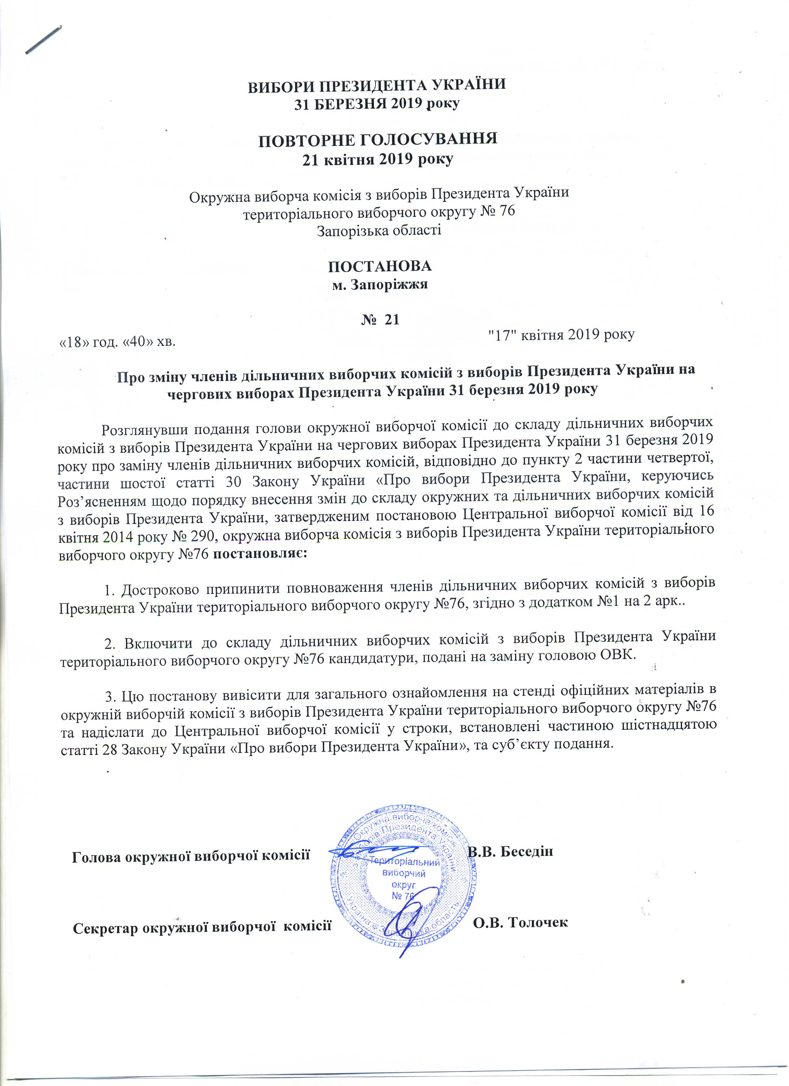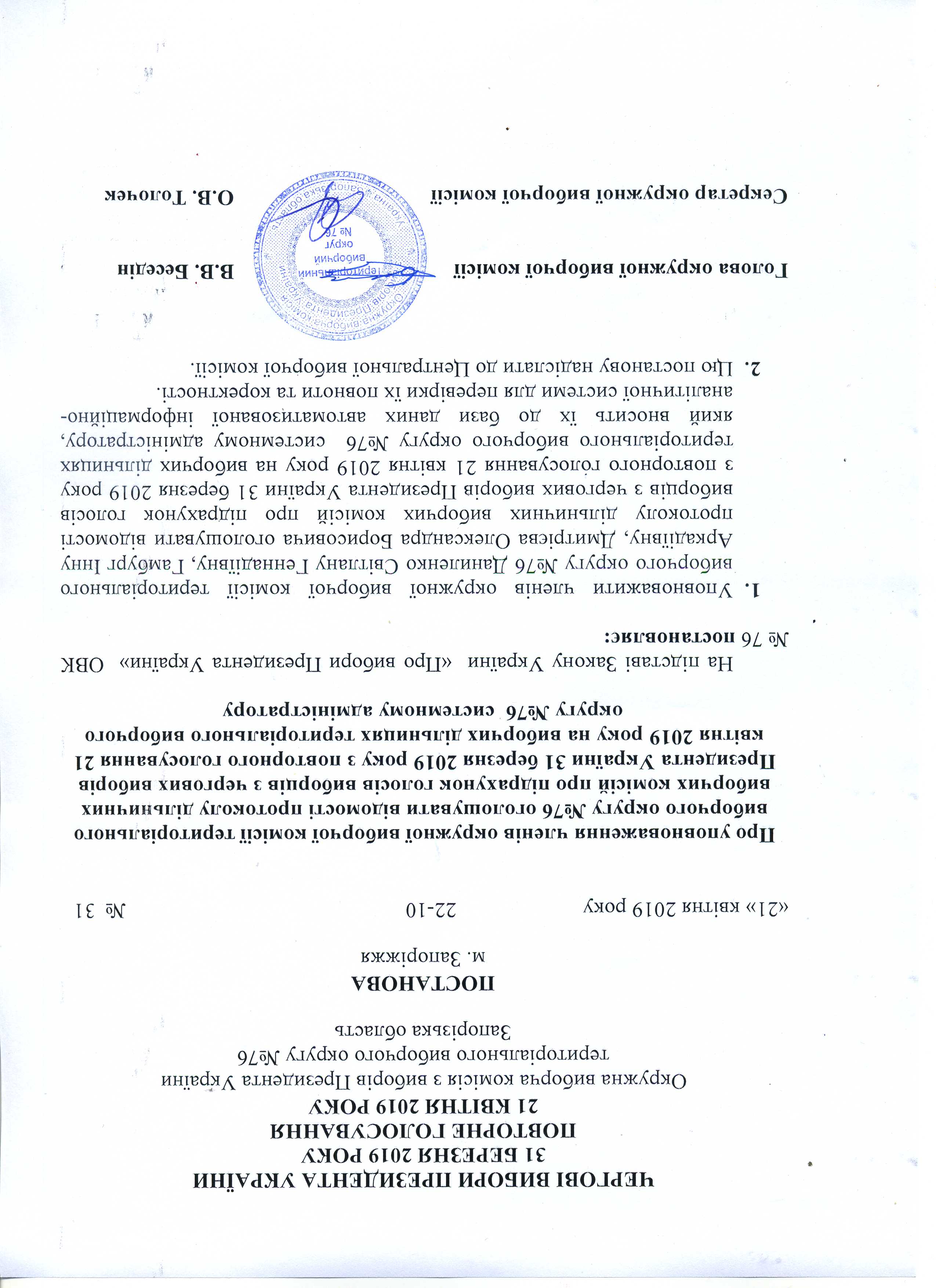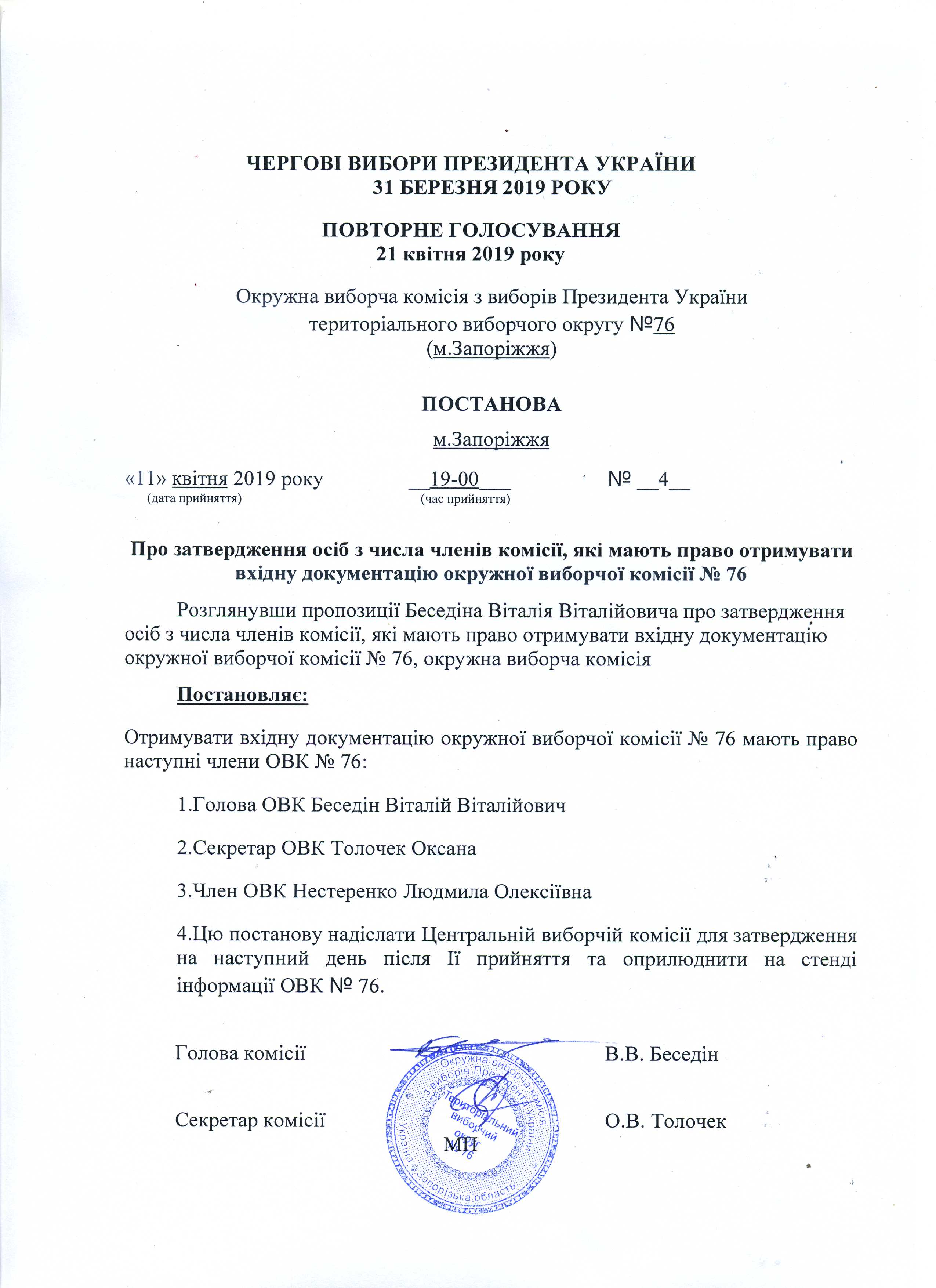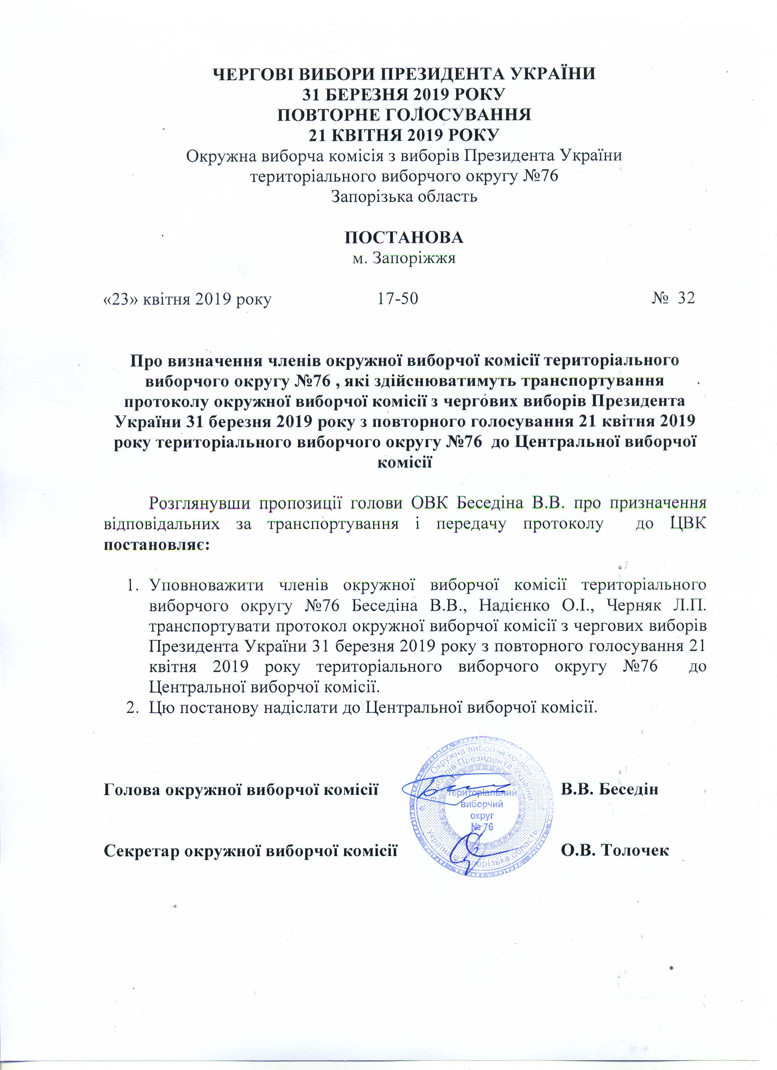 Про визначення членів окружної виборчої коміссії територіального виборчого округу № 76, які здійснюватимуть транспортування протоколу окружної виборчої коміссії з чергових виборів Президента України 31 березня 2019 року з повторного голосування 21 квітня 2019 року територіального виборчого округу № 76 до Центральнолї виборчої комісії |