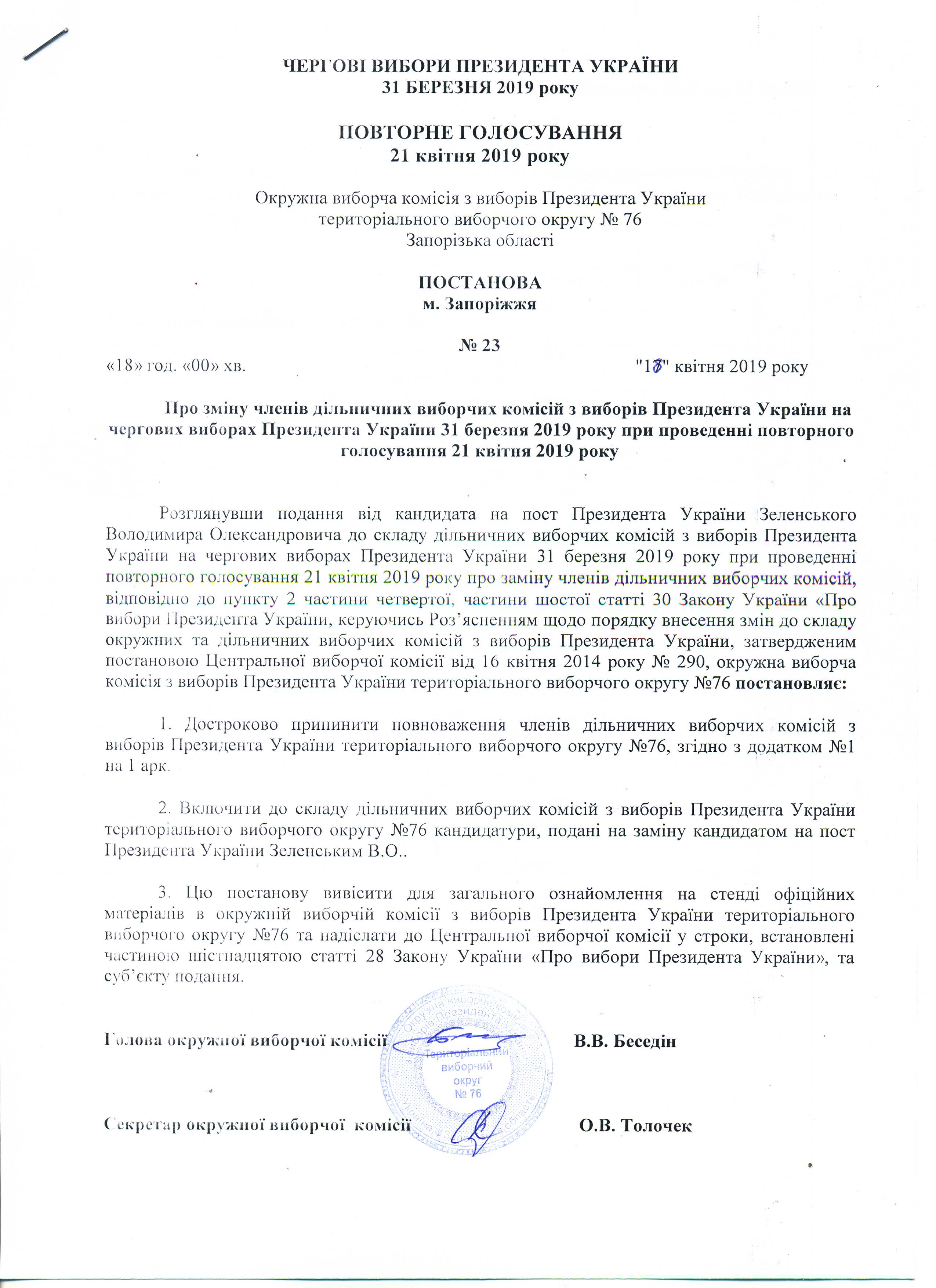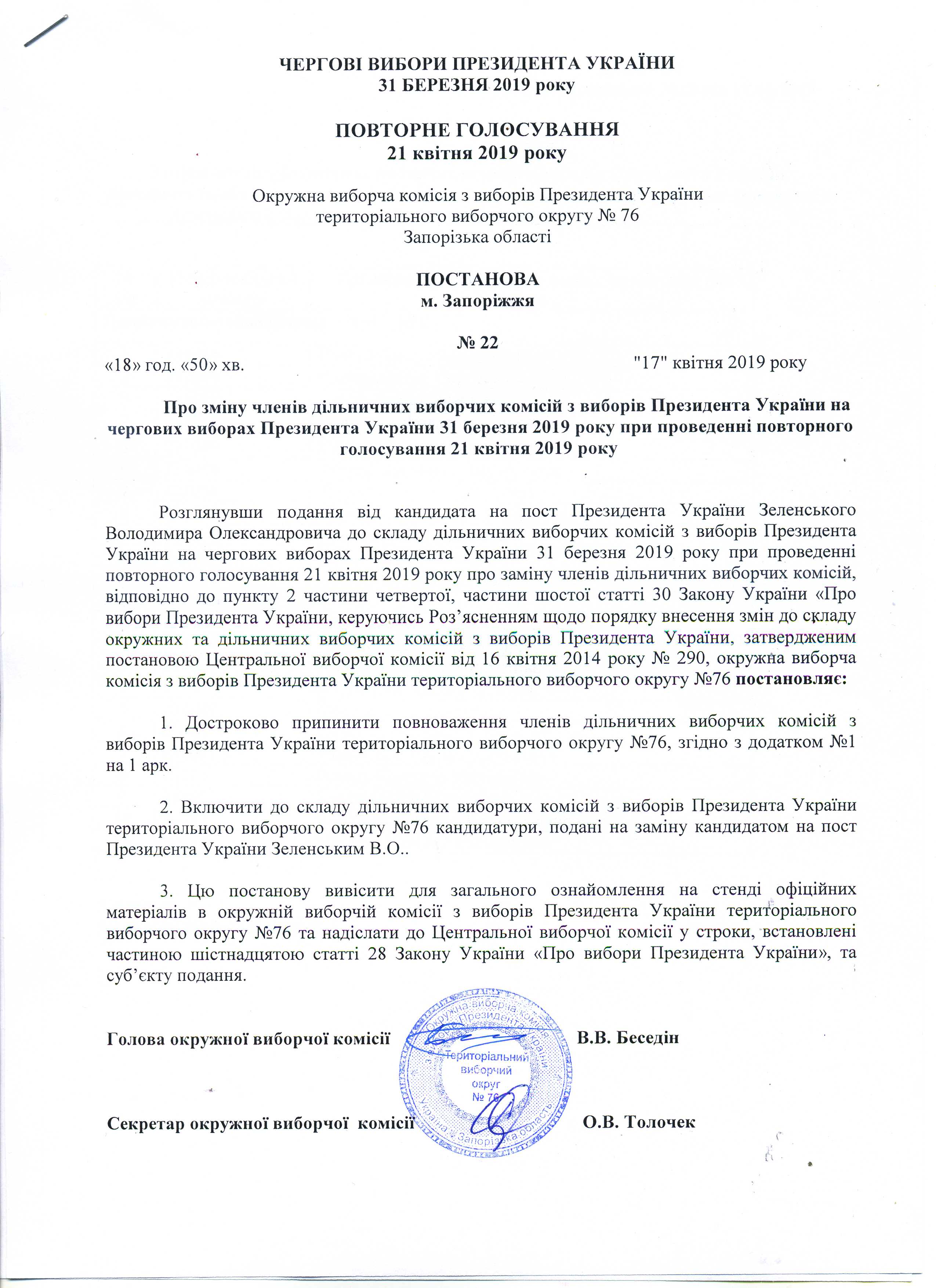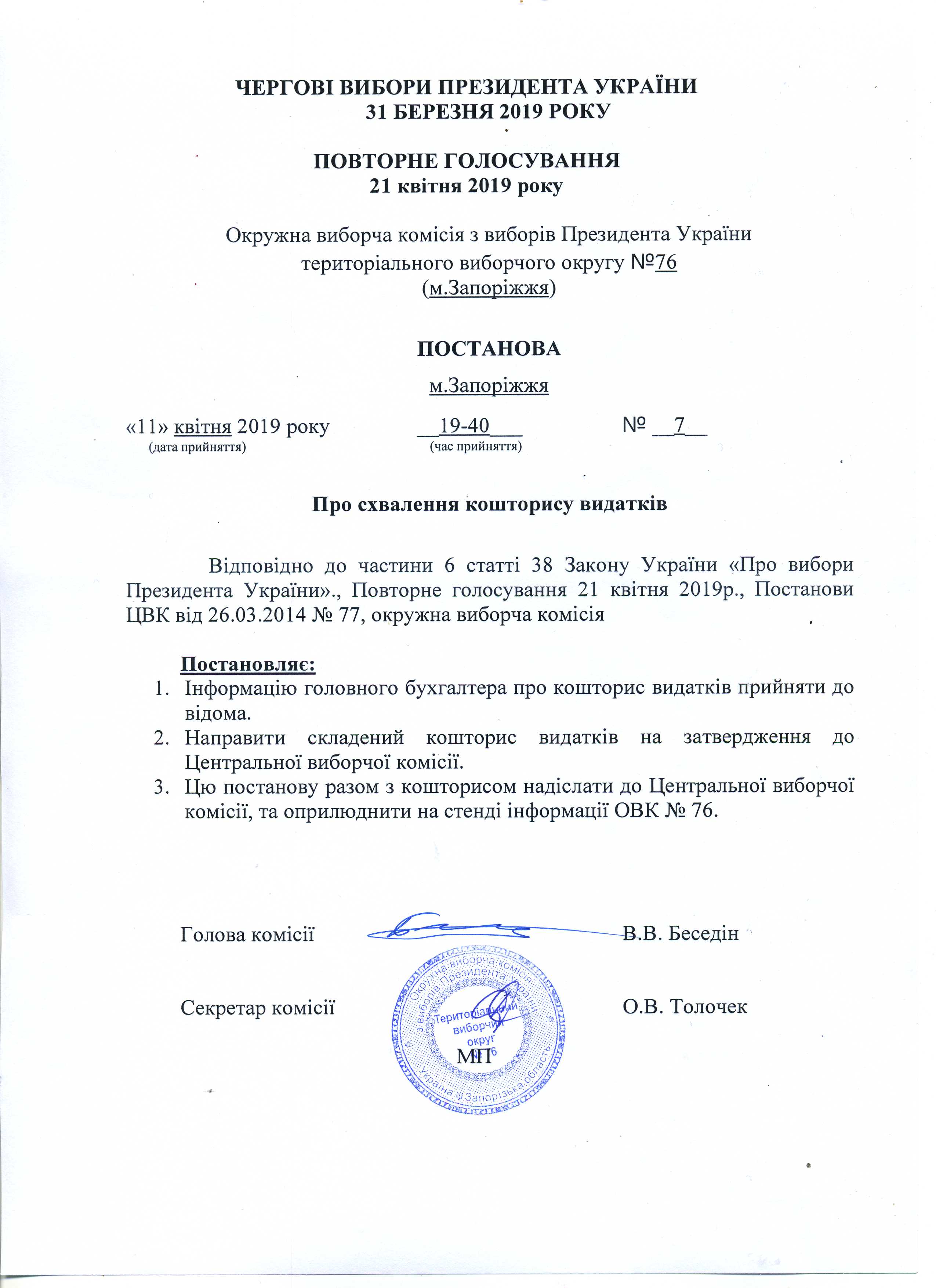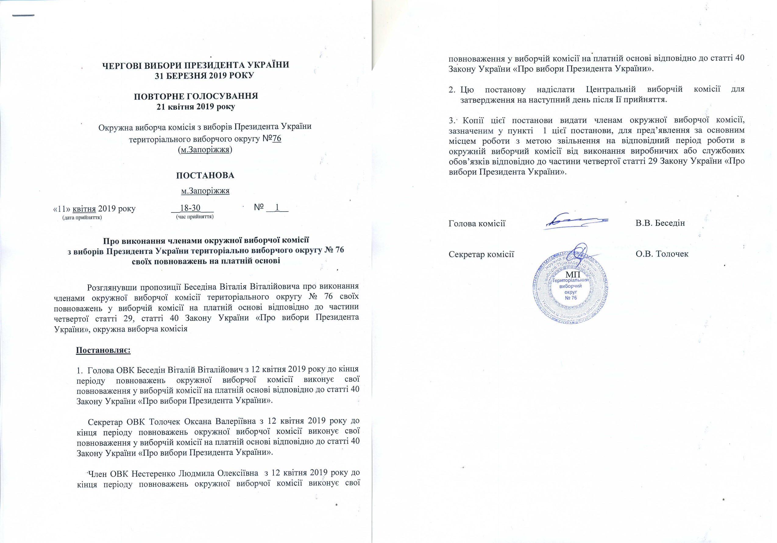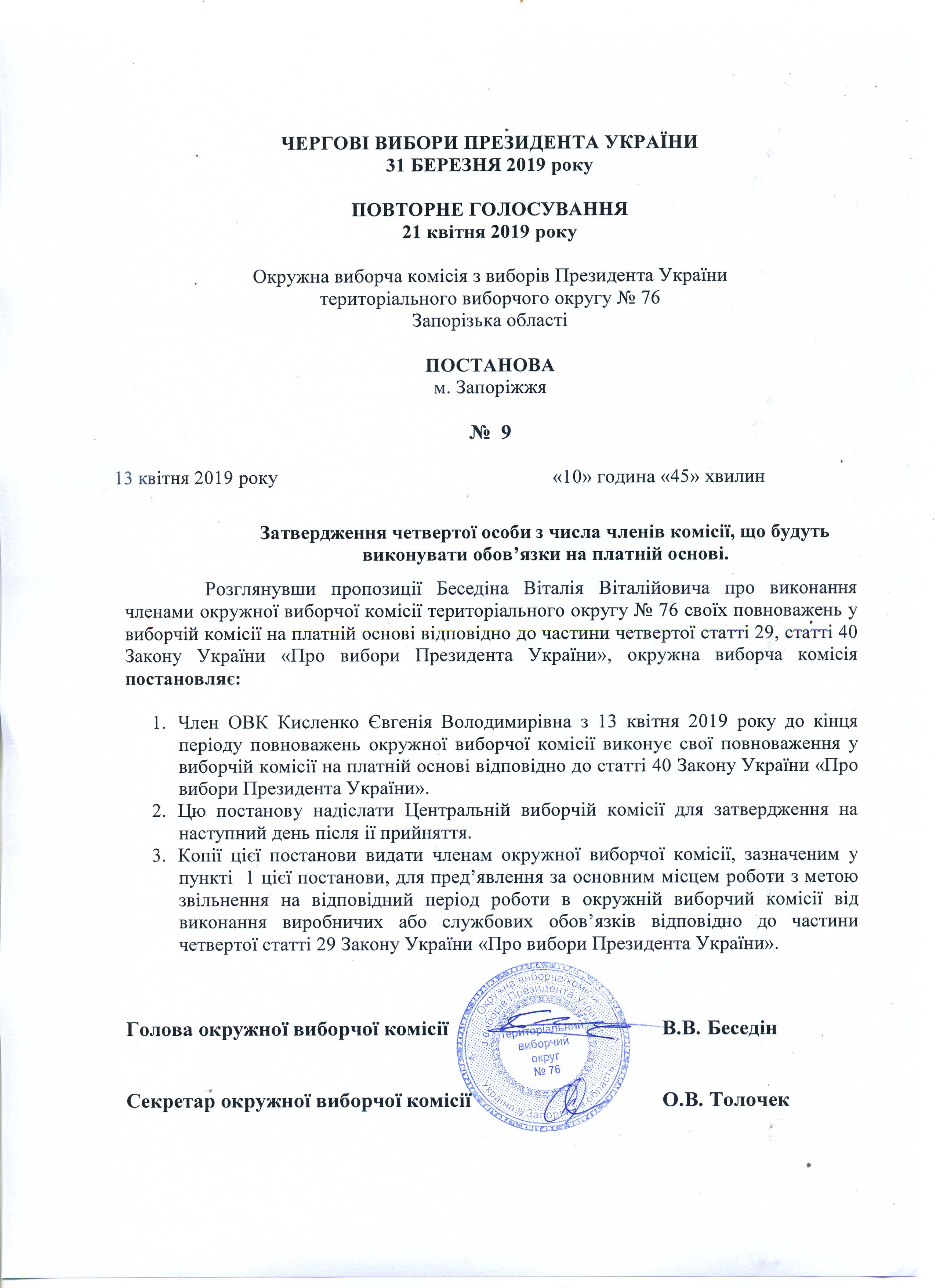 Про визначення членів окружної виборчої коміссії територіального виборчого округу № 76, які здійснюватимуть транспортування протоколу окружної виборчої коміссії з чергових виборів Президента України 31 березня 2019 року з повторного голосування 21 квітня 2019 року територіального виборчого округу № 76 до Центральнолї виборчої комісії |