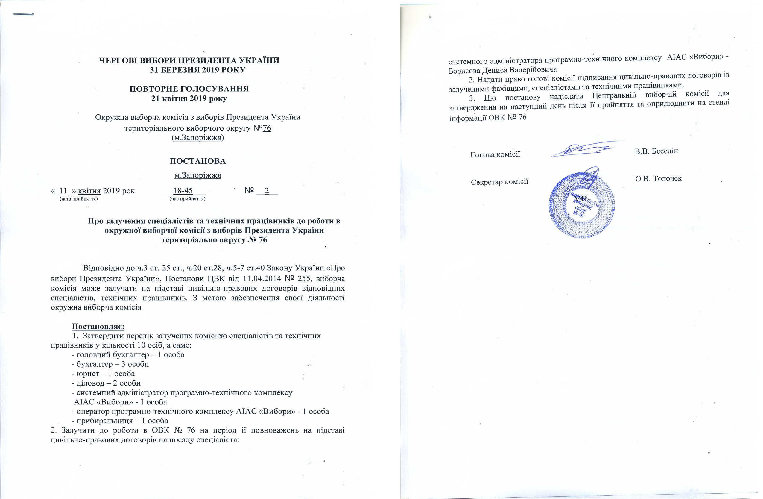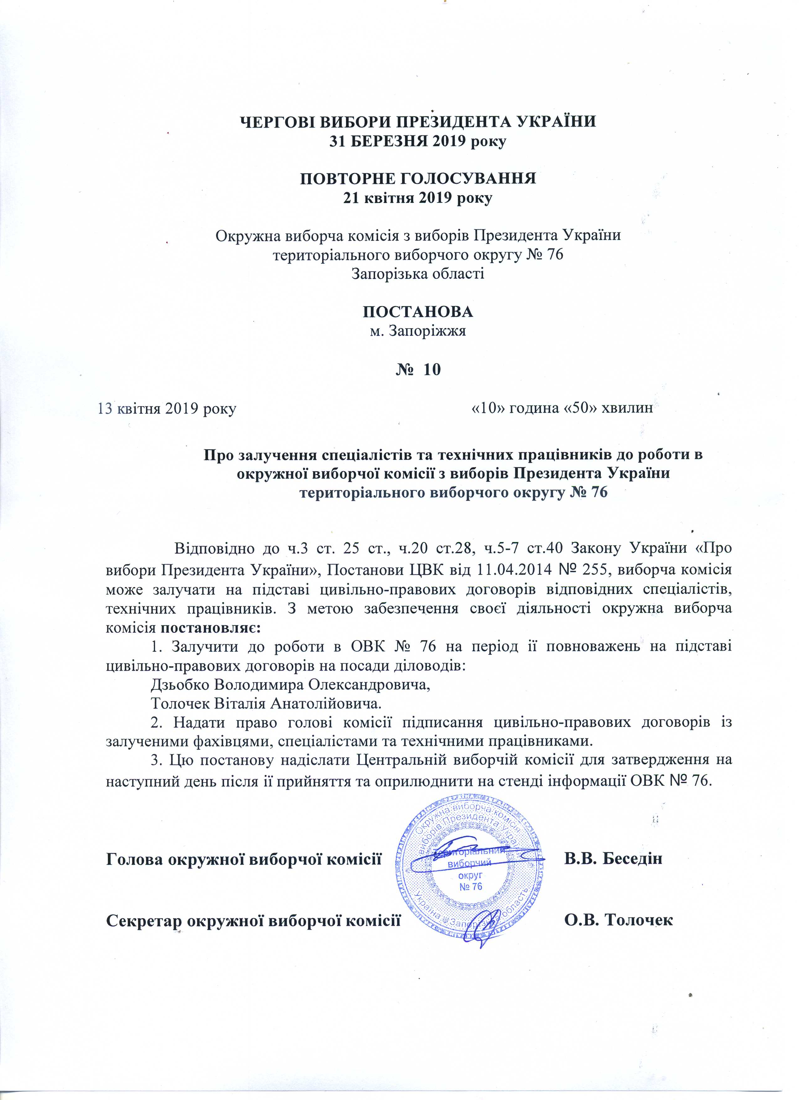 Про залучення спеціалістів та технічних працівників до роботи в окружній виборчій комісії з виборів Президента України територіального округу № 76 |