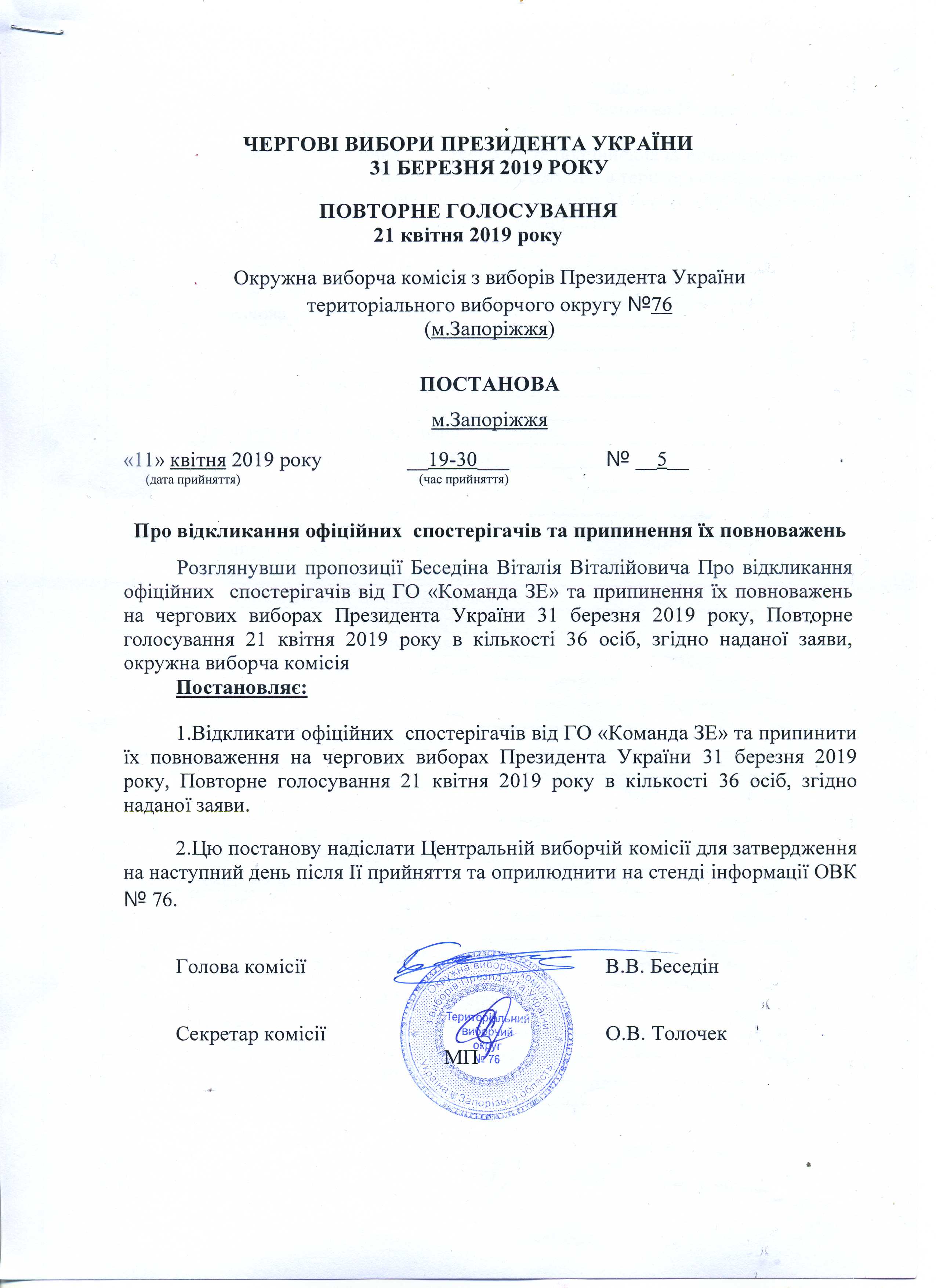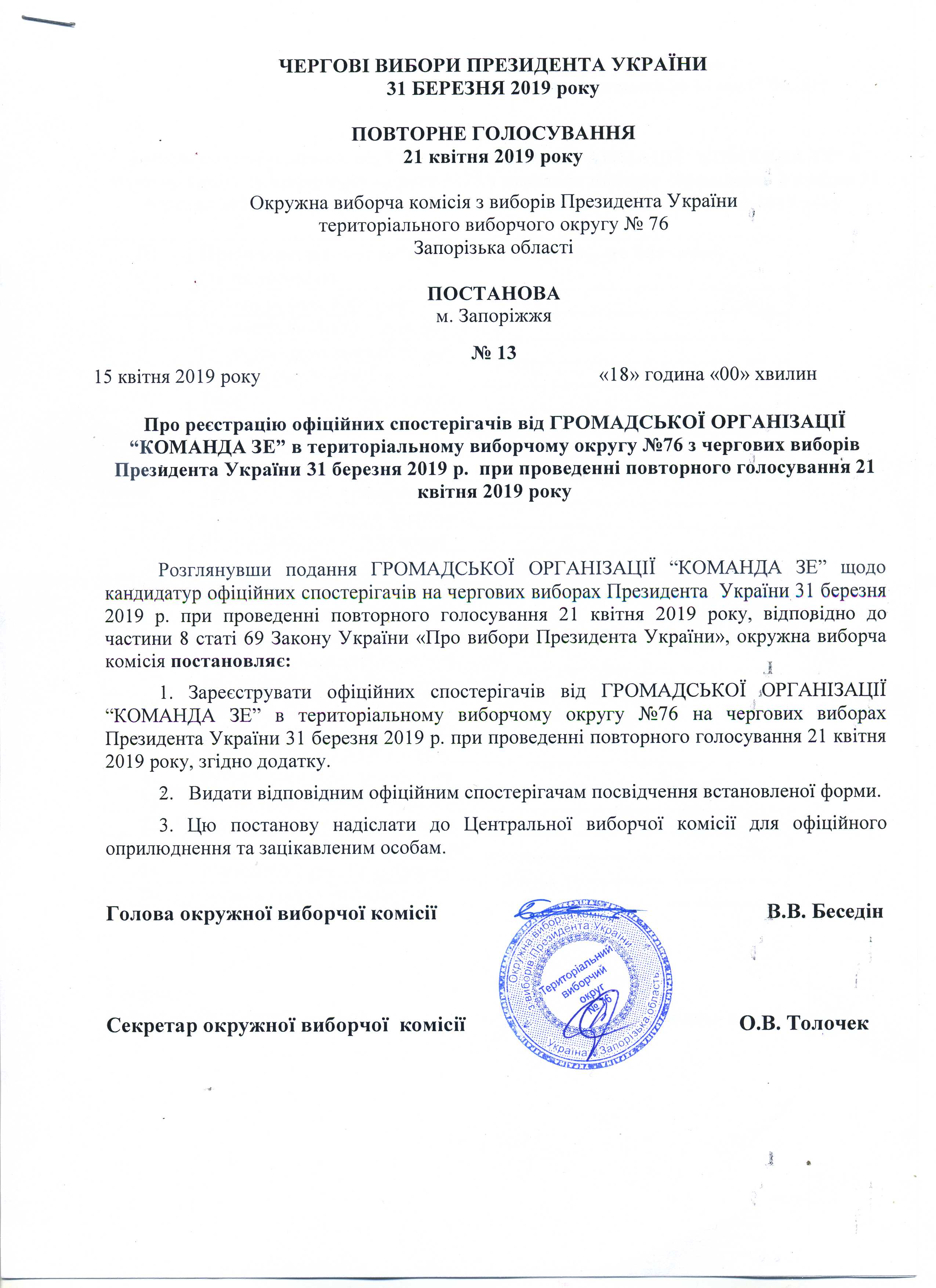Про реєстрацію офіційних спостерігачів від ГРОМАДСЬКОЇ ОРГАНІЗАЦІЇ "КОМАНДА ЗЕ" в територіальному виборчому округу № 76 з чергових виборів Президента України 31 березня 2019 р. при проведенні повторного голосування 21 квітня 2019 року |