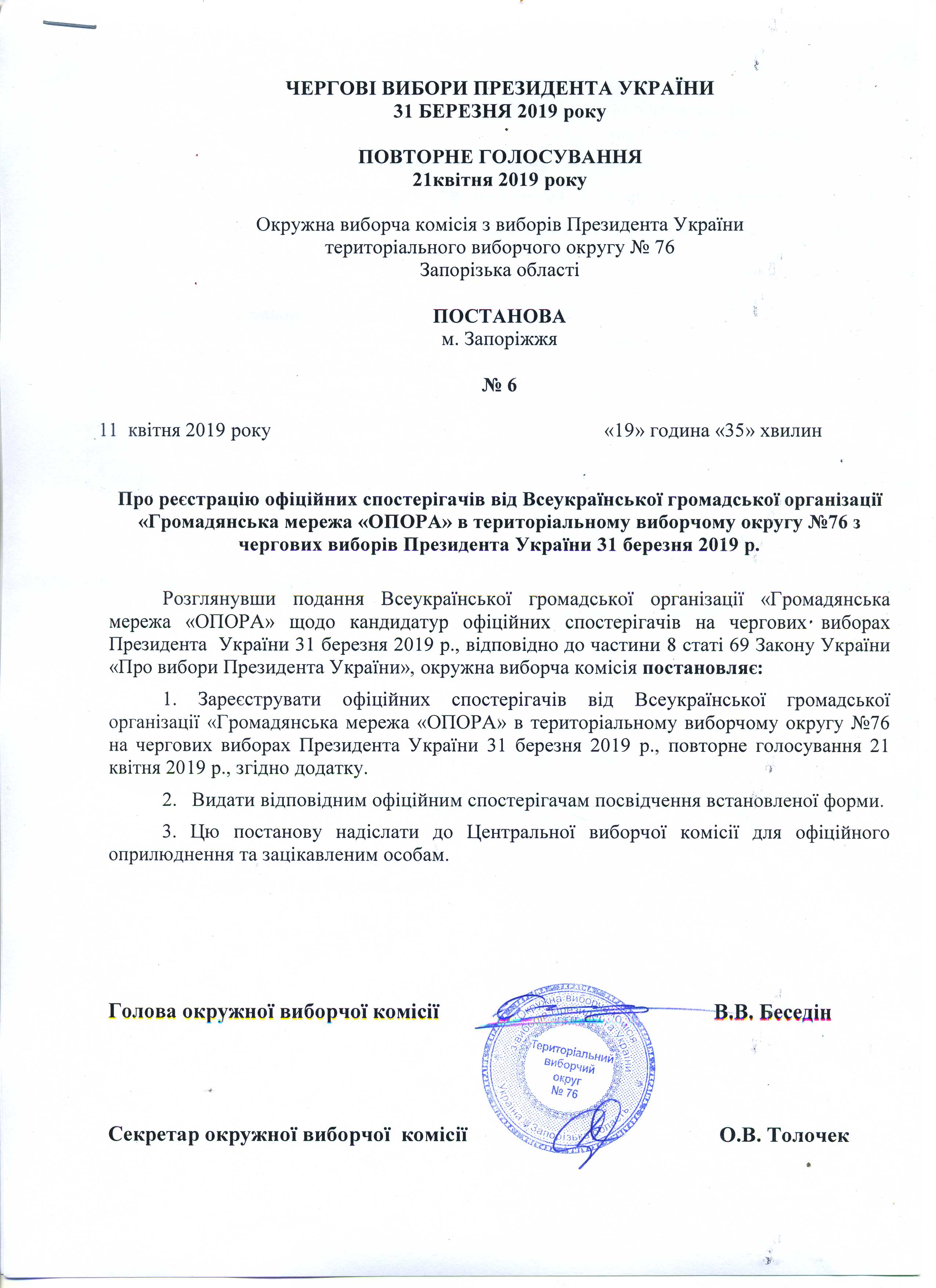 Про реєстрацію офіційних спостерігачів від Всеукраїнської громадської організації "Громадянська мережа "Опора" в територіальному виборчому округу № 76 з чергових виборів Президента України 31 березня 2019 р. |