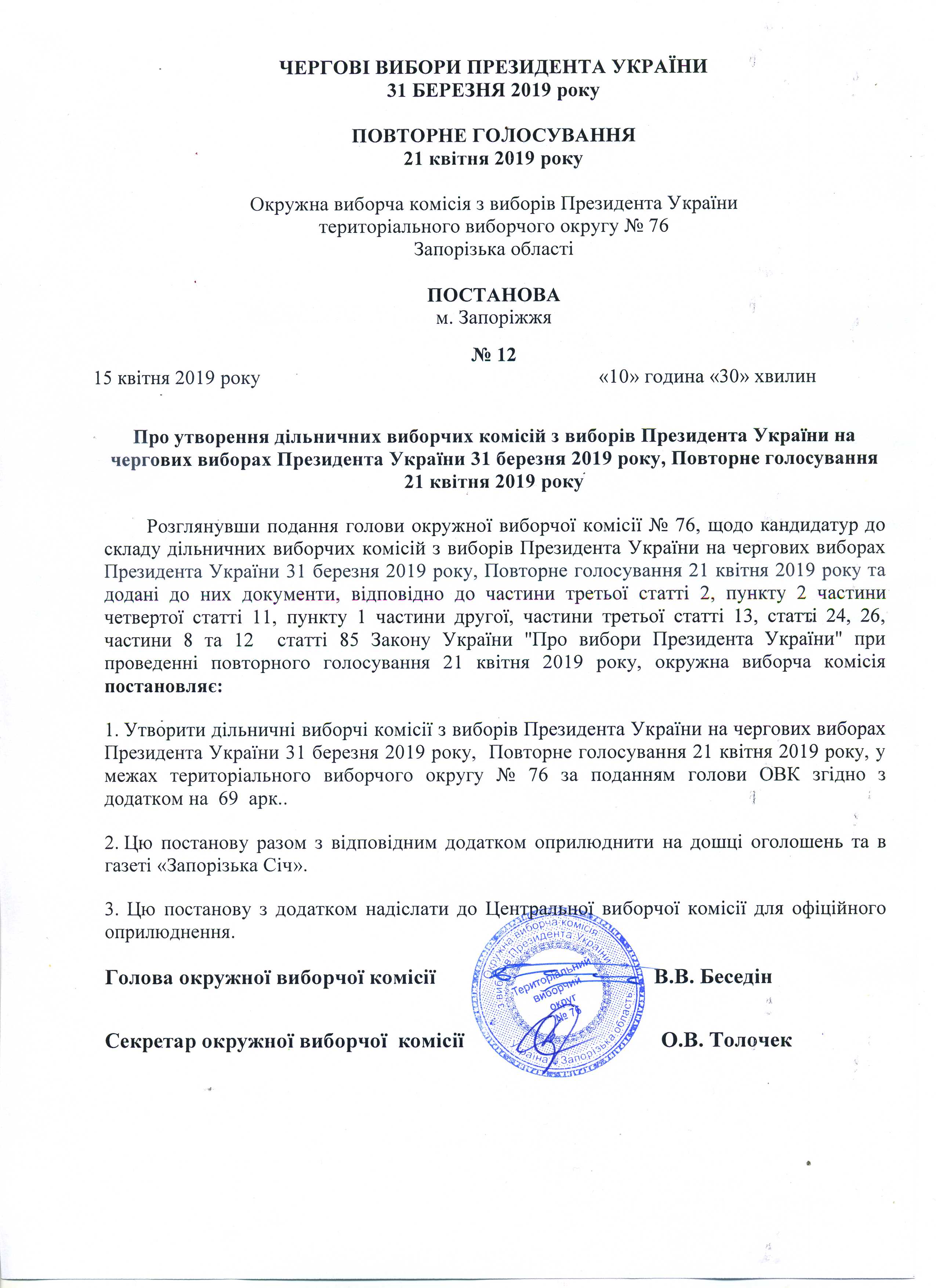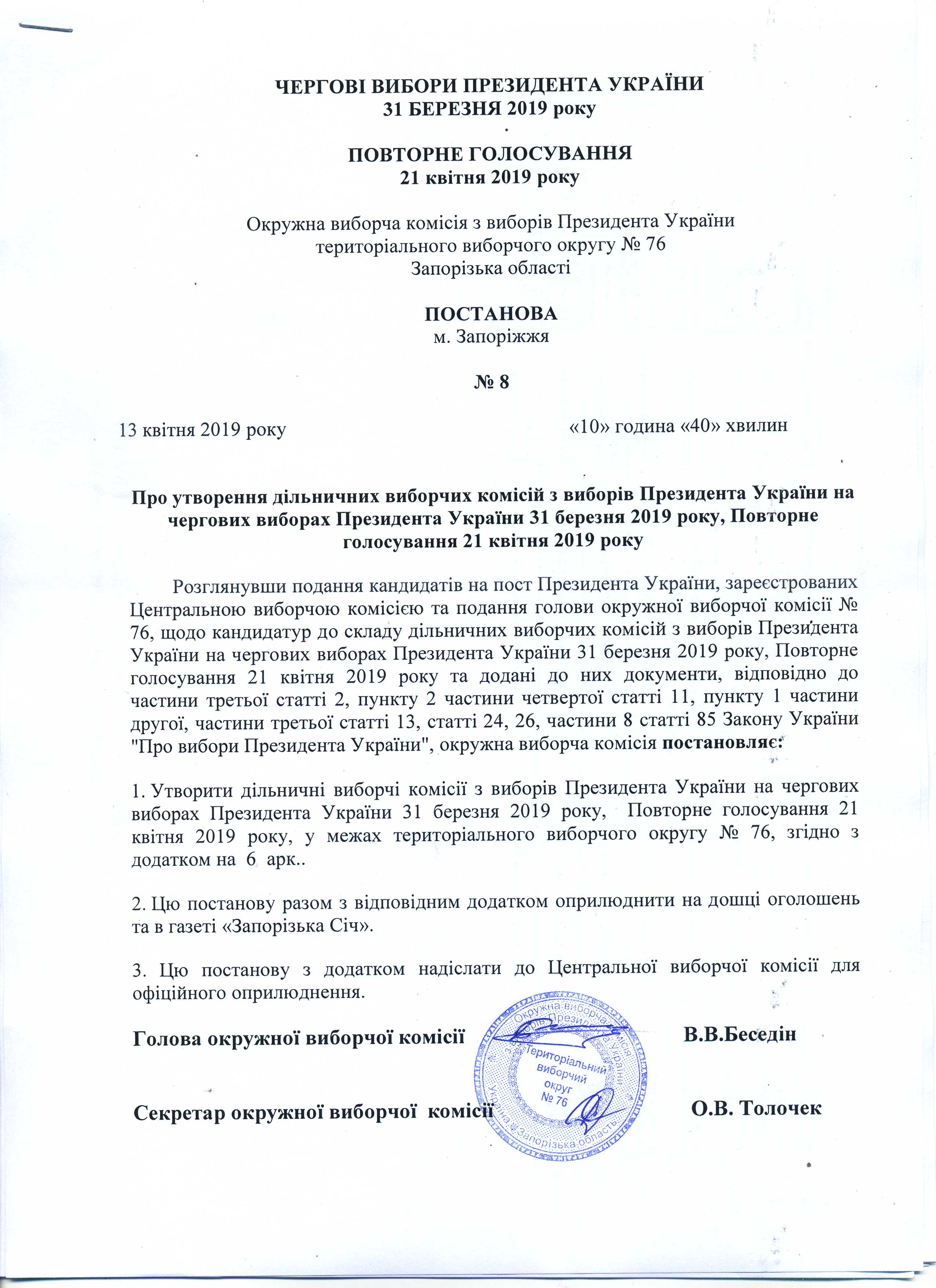Про утворення дільничіх виборчих комісій з виборів Президента України на чергових виборах Президента України 31 березня 2019 року, Повторне голосування 21 квітня 2019 року |