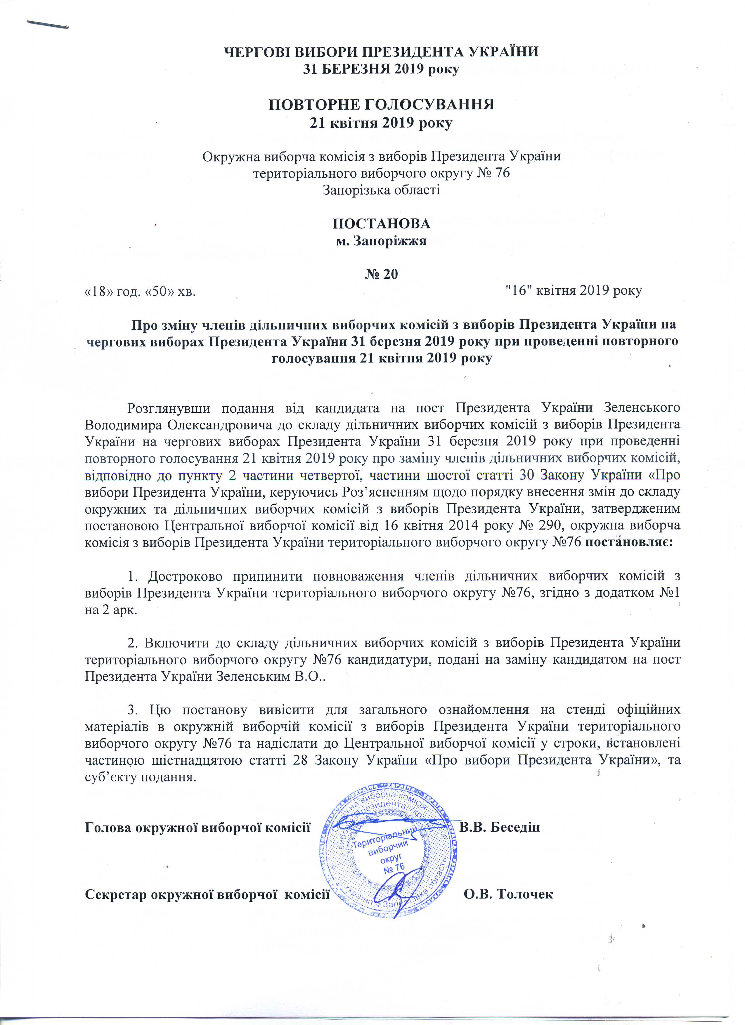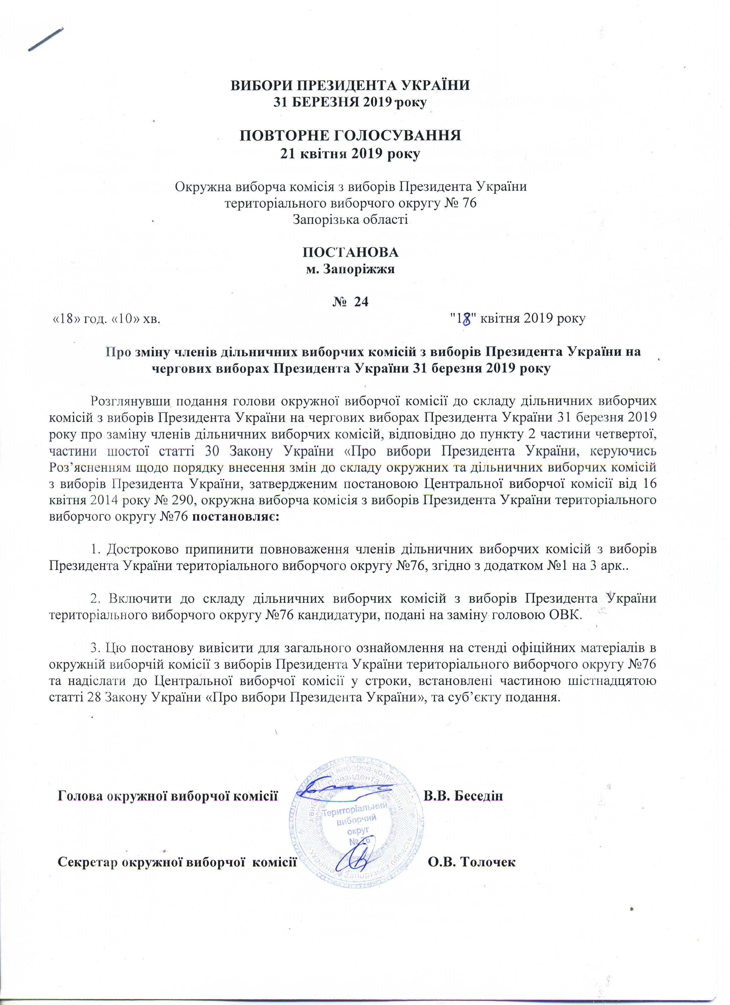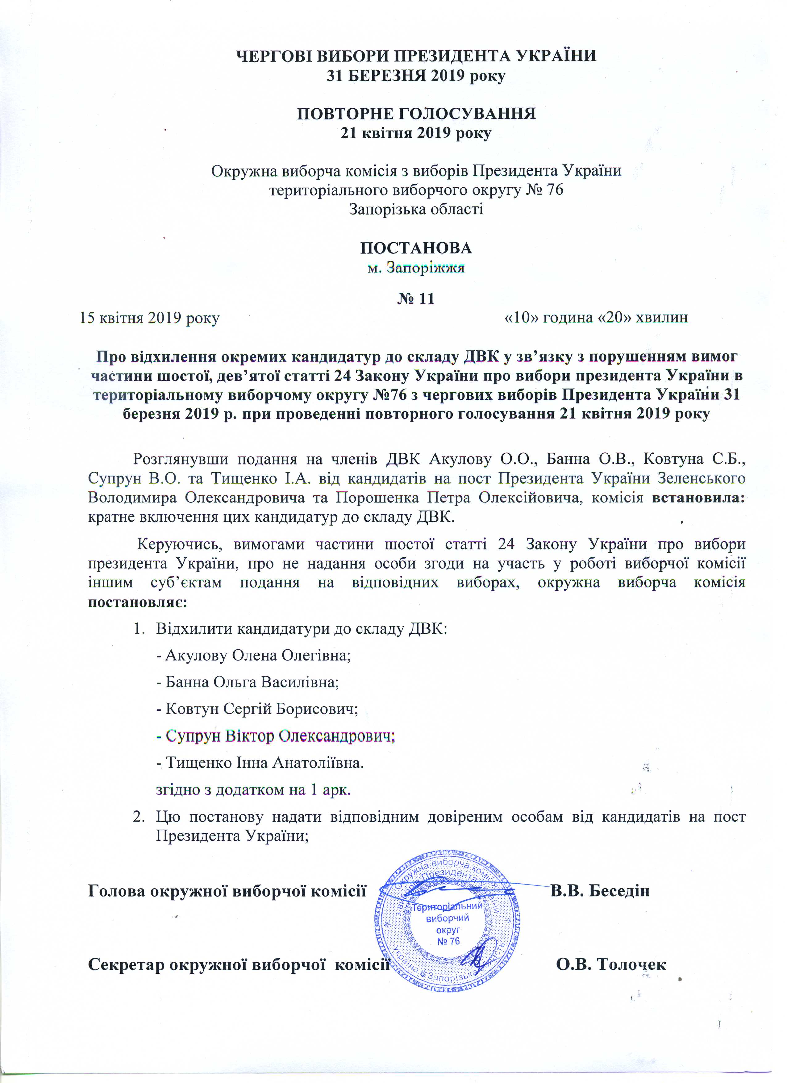 Про відхилення окремих кандидатур до складу ДВК у зв'язку з порушенням вимог частини шостої, дев'ятої статті 24 Закону України про вибори президента України в територіальному виборчому округу № 76 з чергових виборів Президента України 31 березня 2019 р. при проведенні повторного голосування 21 квітня 2019 року |