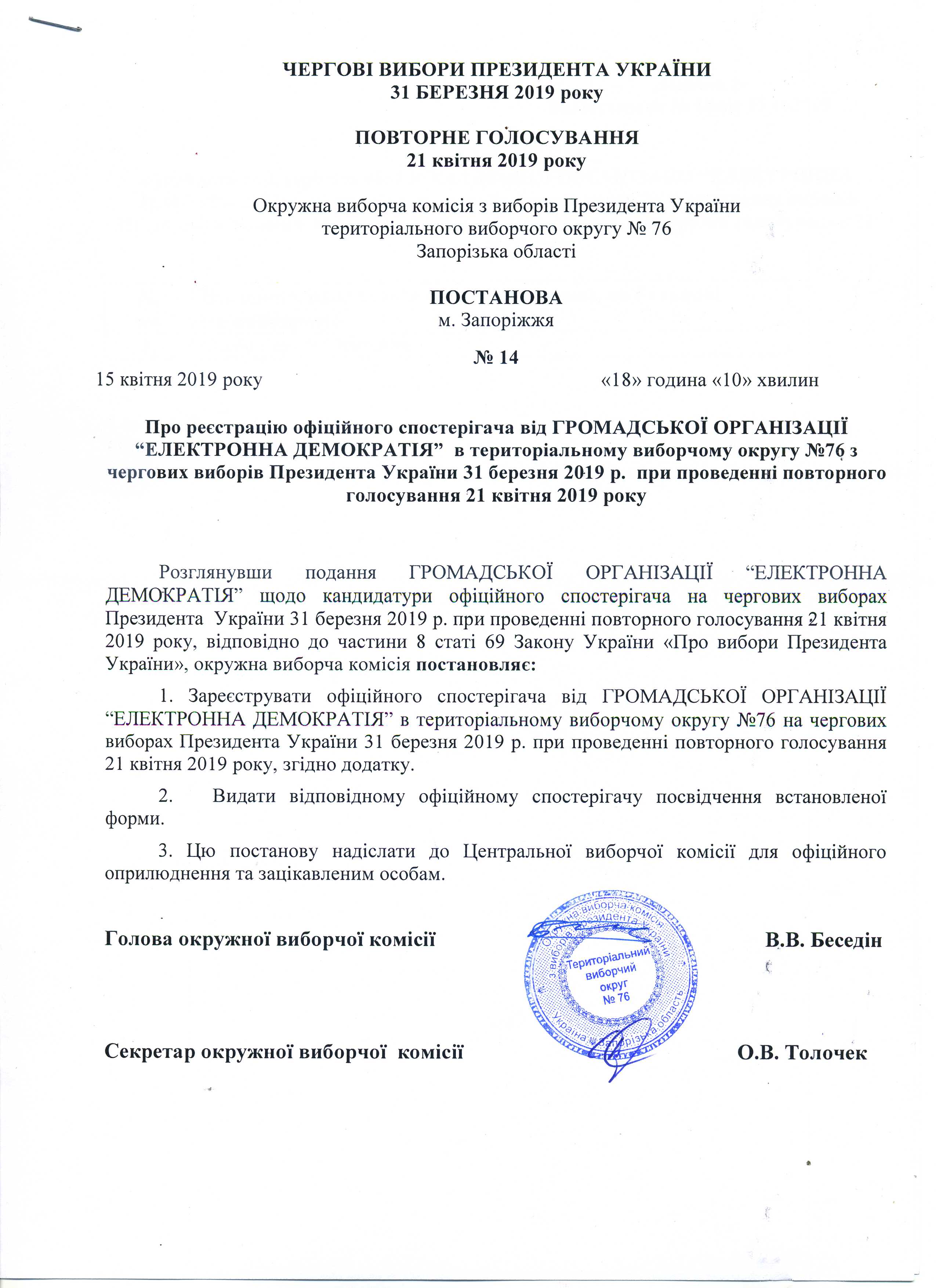 Про реєстрацію офіційних спостерігачів від ГРОМАДСЬКОЇ ОРГАНІЗАЦІЇ "ЕЛЕКТРОННА ДЕМОКРАТІЯ" в територіальному виборчому округу № 76 з чергових виборів Президента України 31 березня 2019 р. при проведенні повторного голосування 21 квітня 2019 року |
