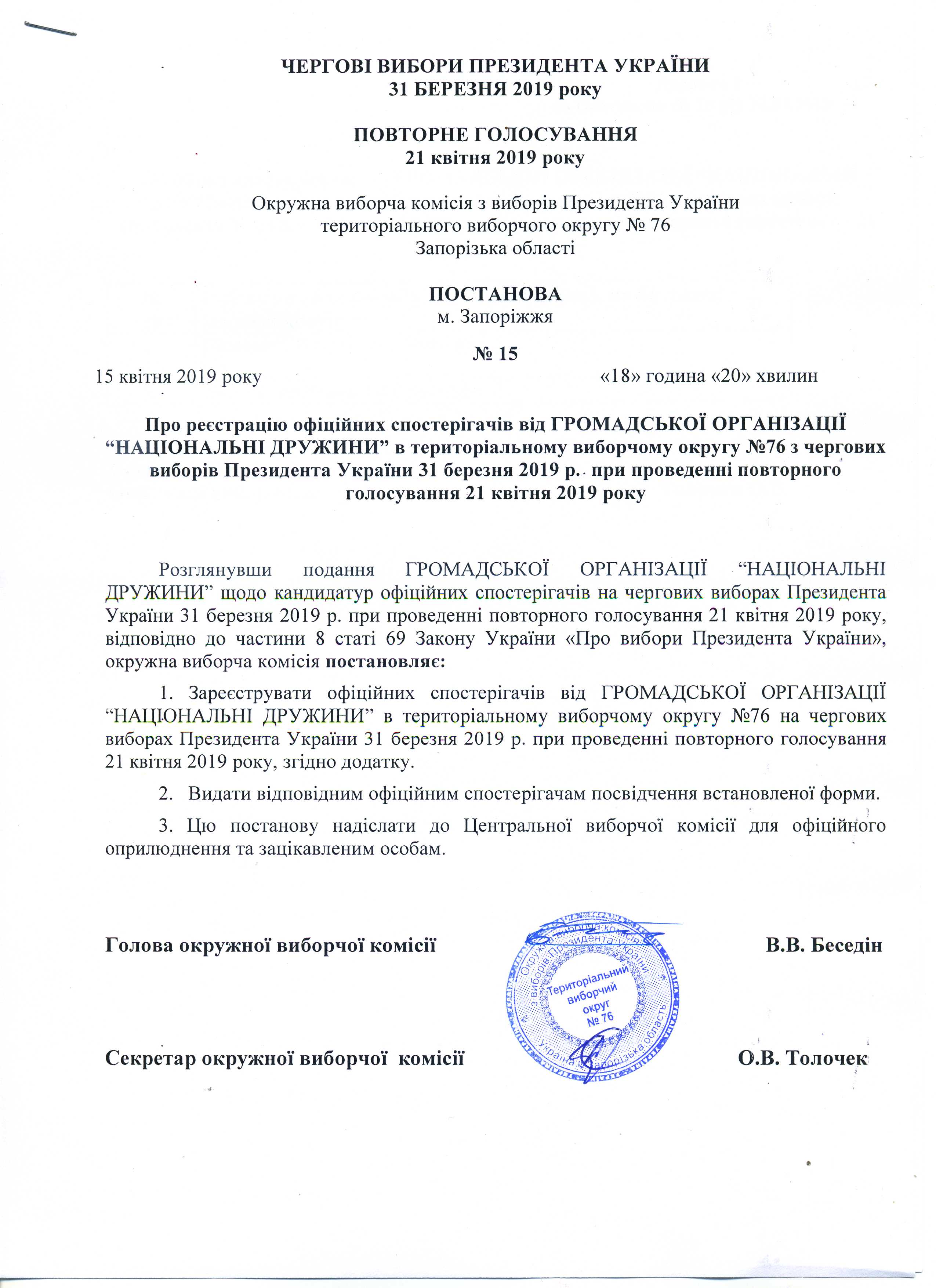 Про реєстрацію офіційних спостерігачів від ГРОМАДСЬКОЇ ОРГАНІЗАЦІЇ "НАЦІОНАЛЬНІ ДРУЖИНИ" в територіальному виборчому округу № 76 з чергових виборів Президента України 31 березня 2019 р. при проведенні повторного голосування 21 квітня 2019 року |