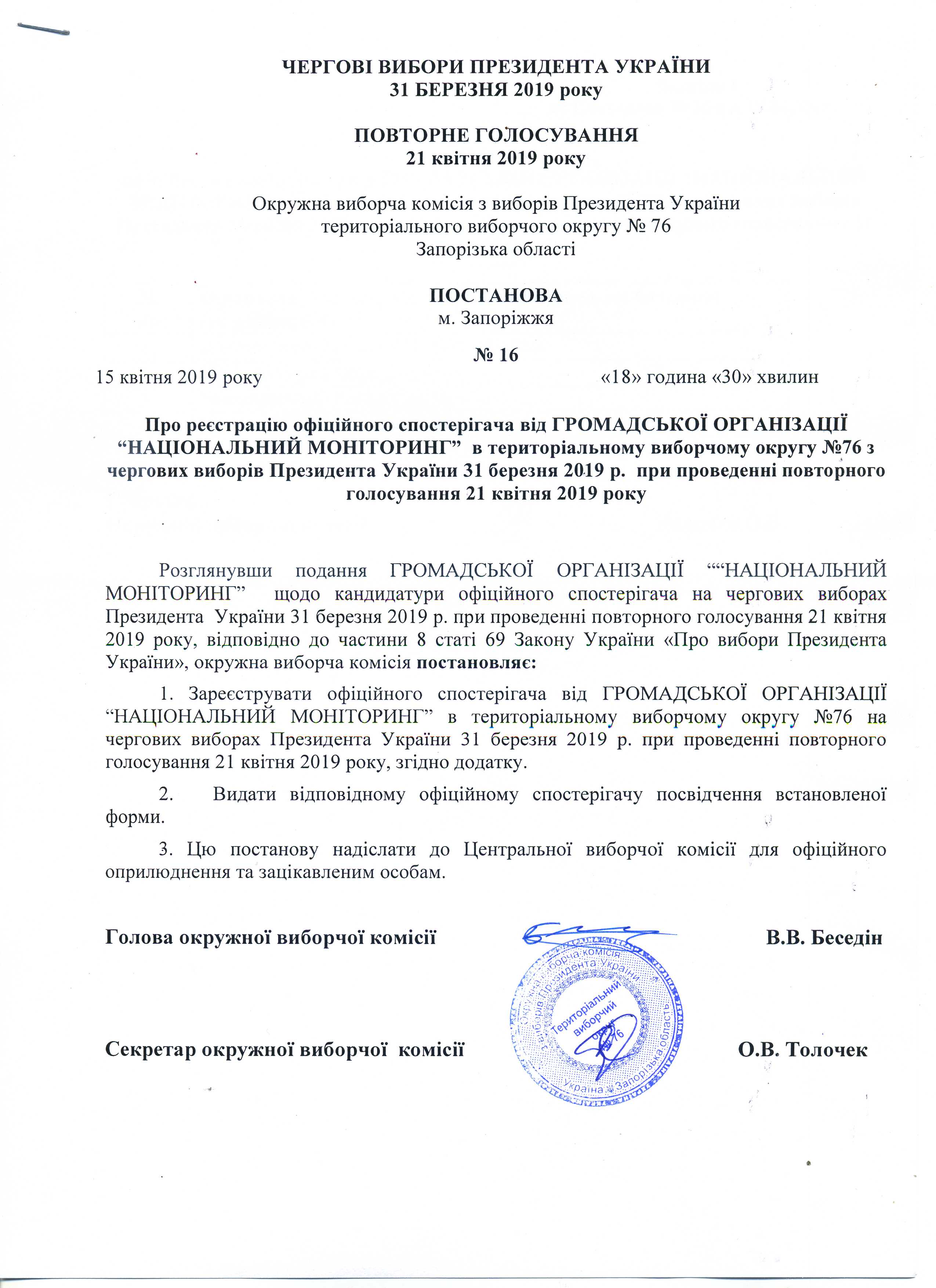 Про реєстрацію офіційних спостерігачів від ГРОМАДСЬКОЇ ОРГАНІЗАЦІЇ "НАЦІОНАЛЬНИЙ МОНІТОРИНГ" в територіальному виборчому округу № 76 з чергових виборів Президента України 31 березня 2019 р. при проведенні повторного голосування 21 квітня 2019 року |
