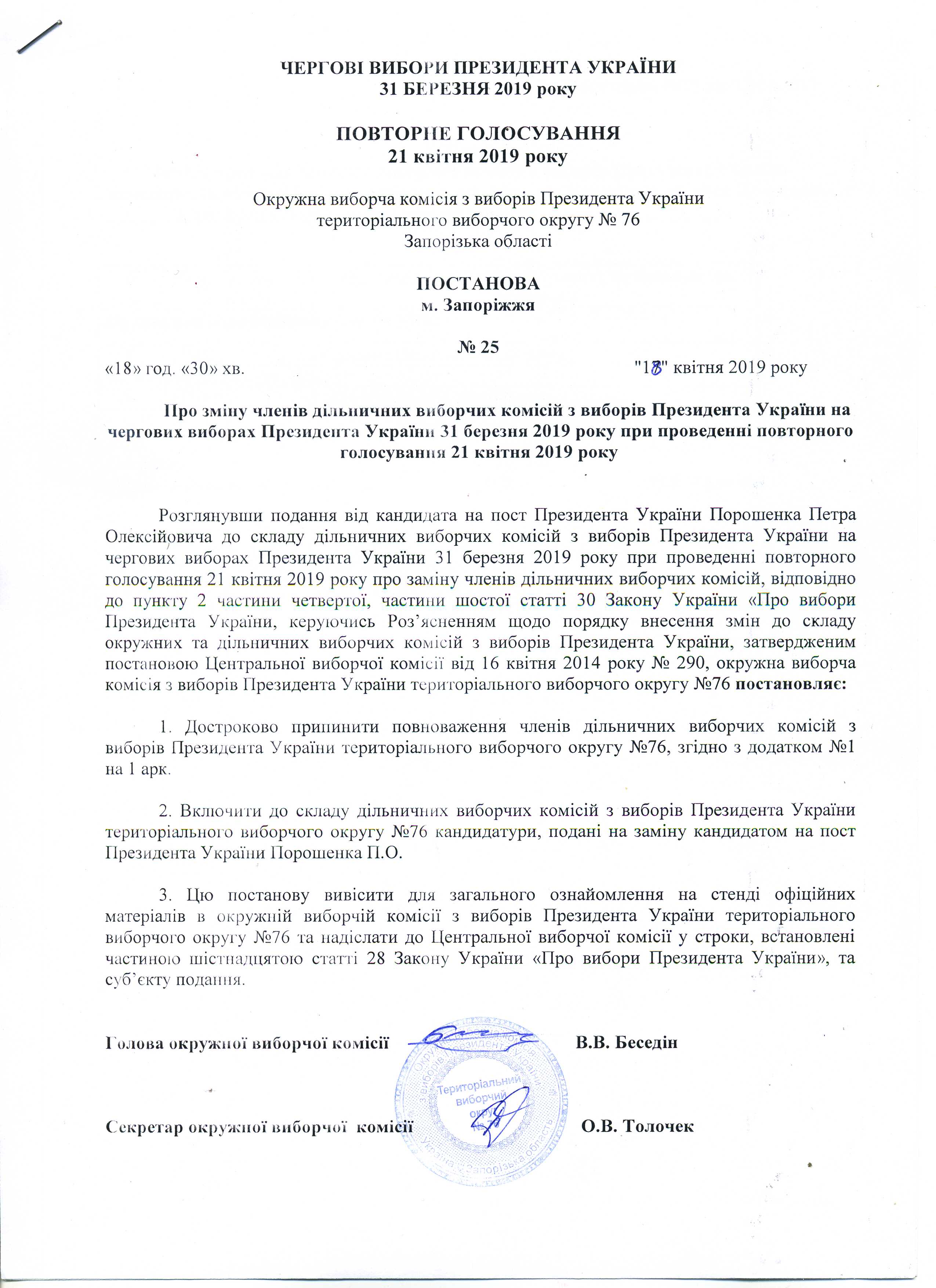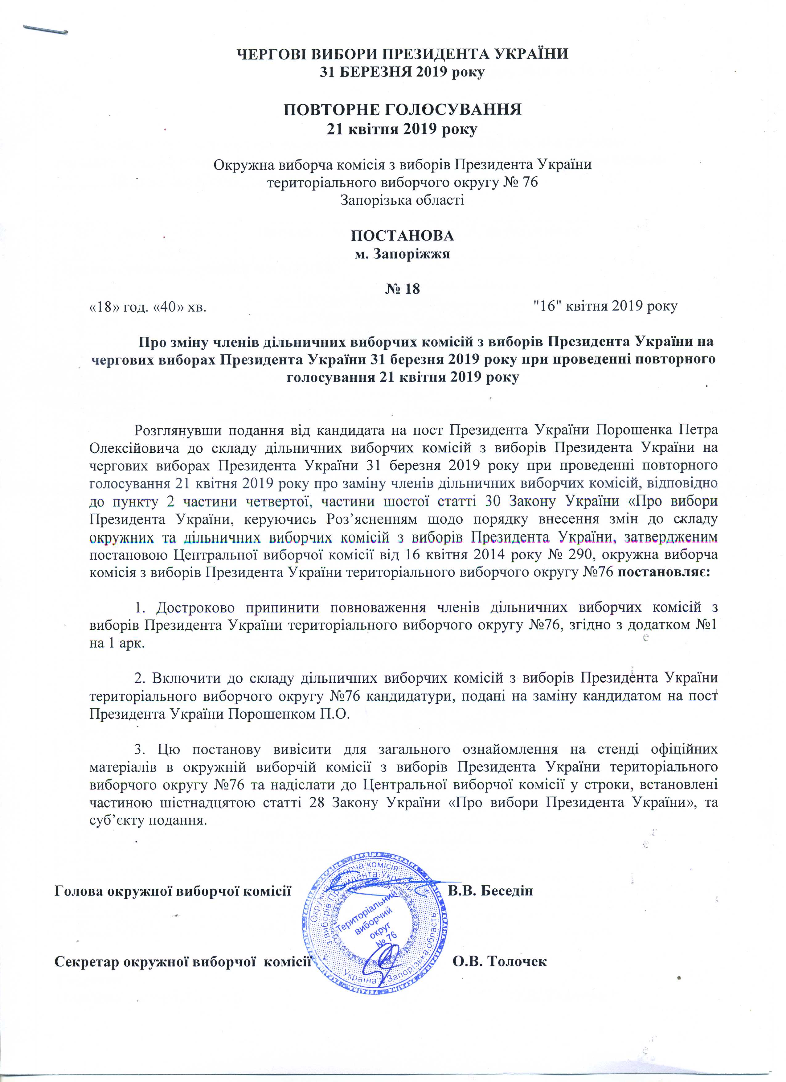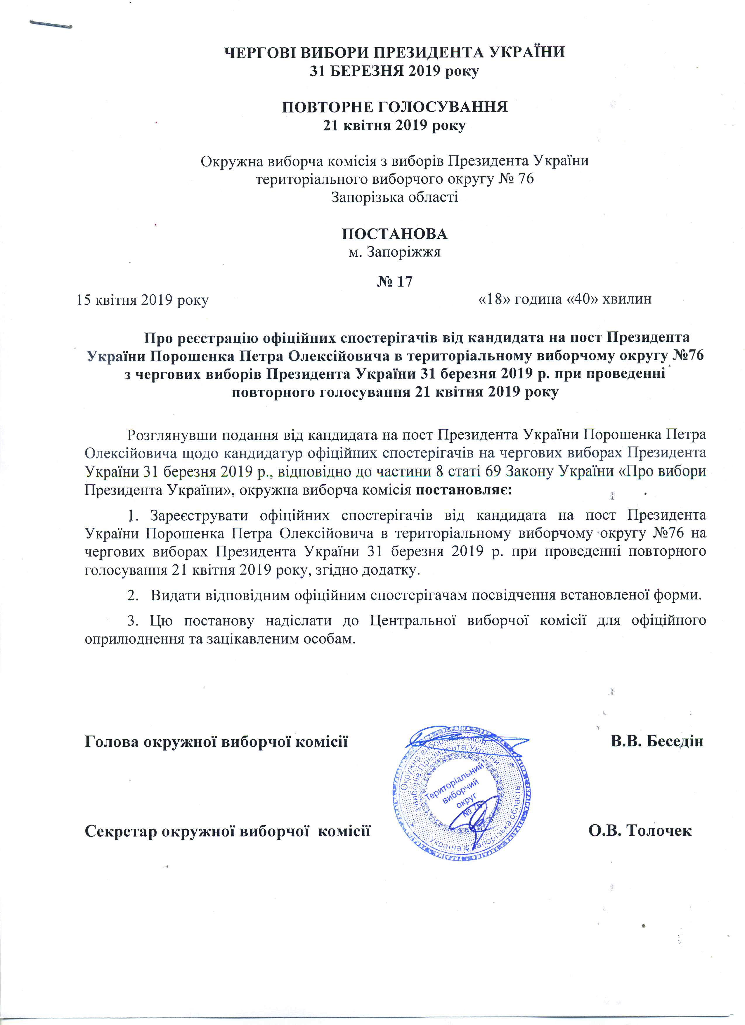 Про реєстрацію офіційних спостерігачів від кандидата на пост Президента України Порошенка Петра Олексійовича в територіальному виборчому округу № 76 з чергових виборів Президента України 31 березня 2019 р. при проведенні повторного голосування 21 квітня 2019 року |