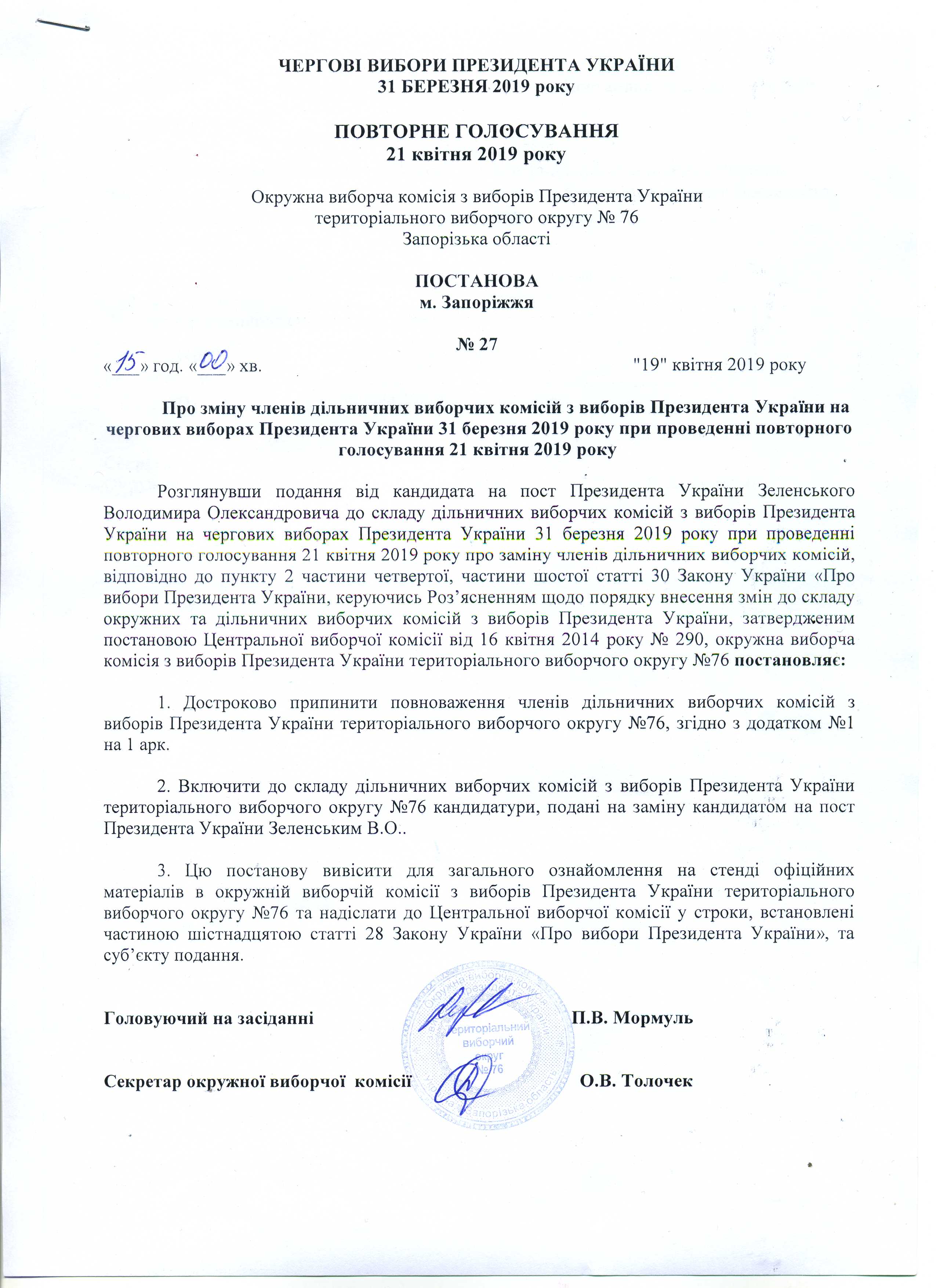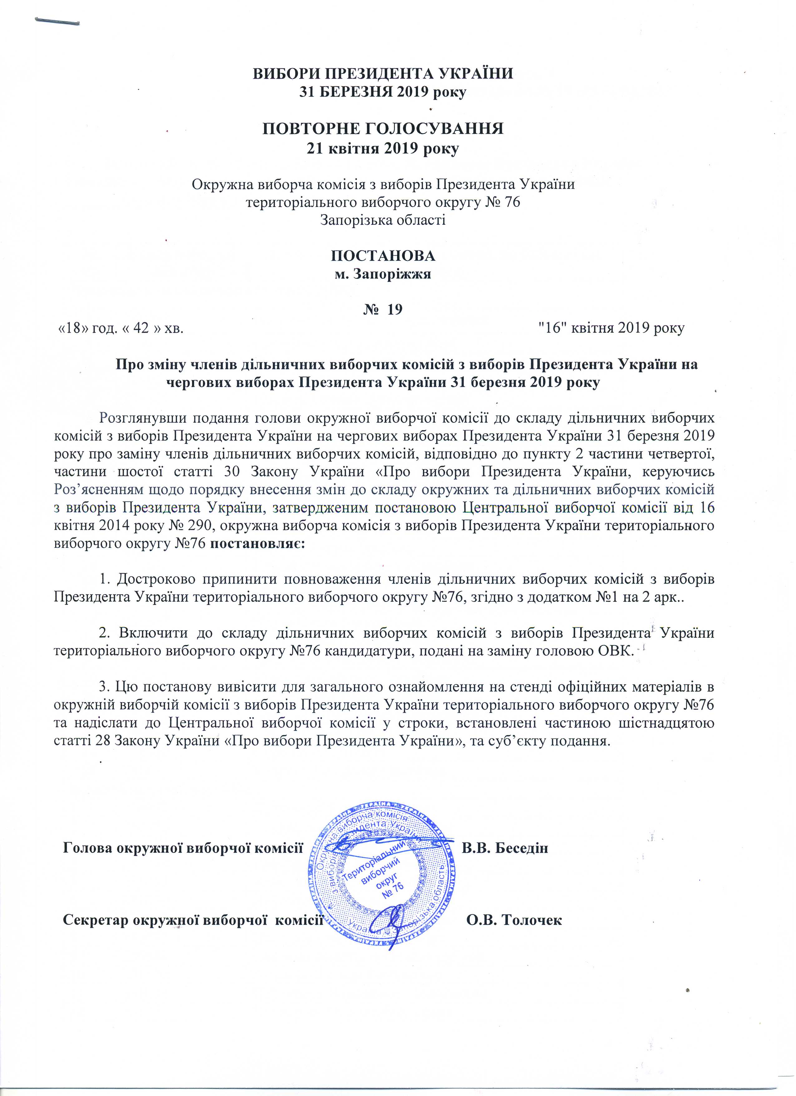 Про зміну членів дільничних виборчих комісій з виборів Президента Украіни на чергових виборах Президента України 31 березня 2019 року при проведенні повторного голосування 21 квітня 2019 року |
