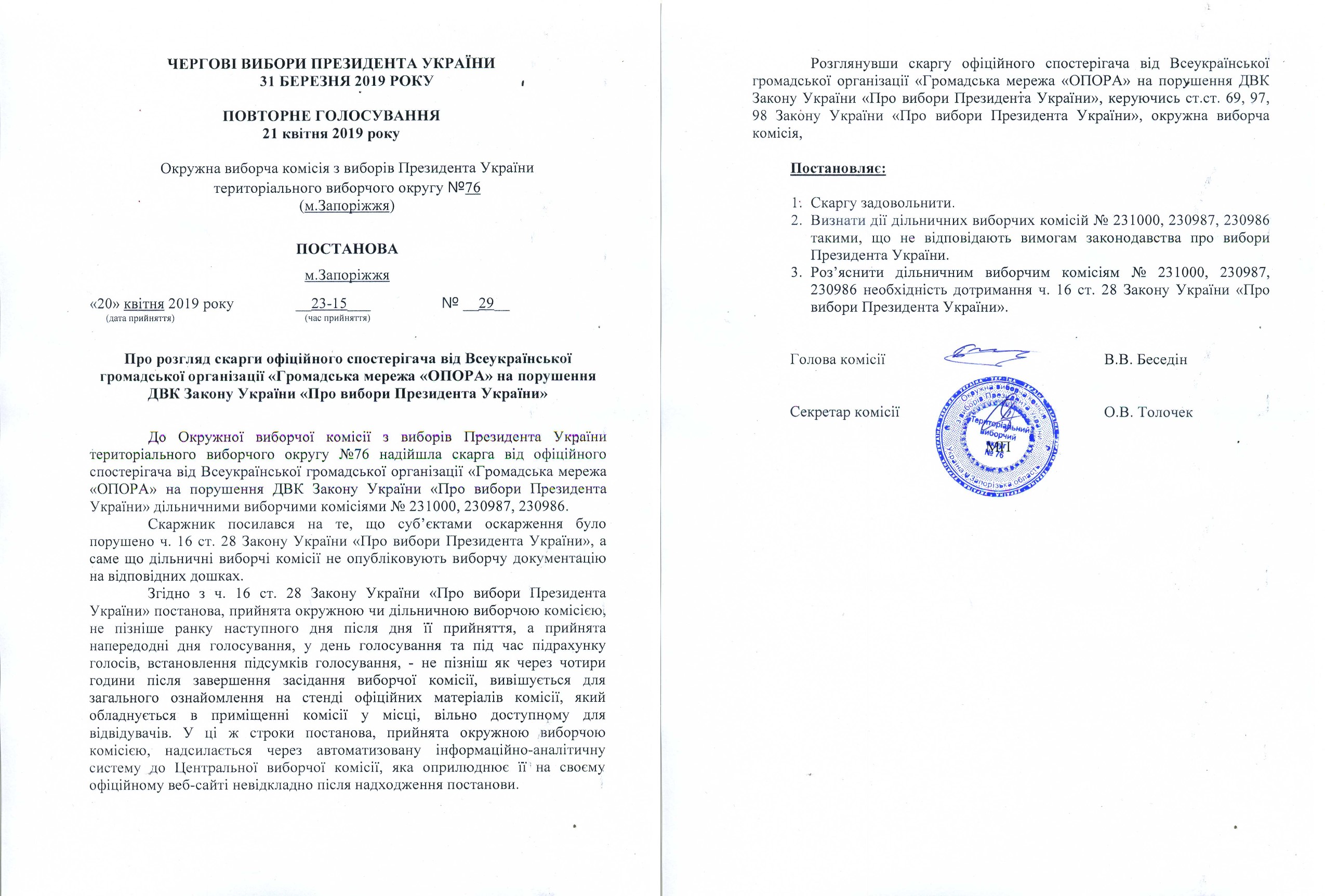 Про розгляд скарги офіційного спостерігача від Всеукраїнської громадської організації "Громадська мережа "ОПОРА"" на порушення ДВК Закону України "Про вибори Президента України" |