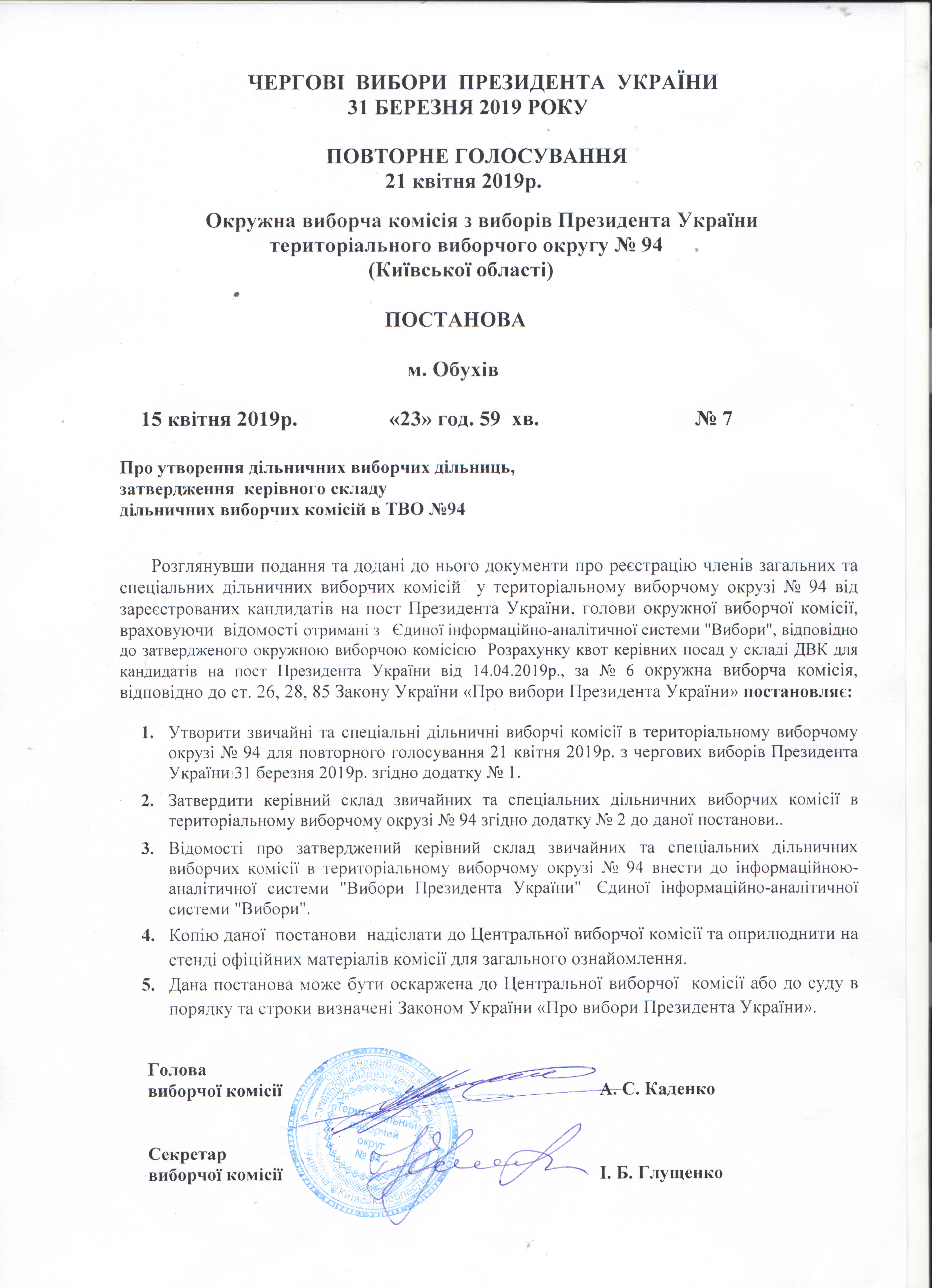 | 7 від 15.04.2019 | Постанова ОВК | Про утворення дільничних виборчих дільниць, затвердження керівного складу дільничних виборчих комісій в ТВО №94 |